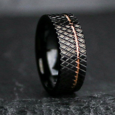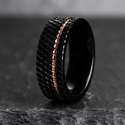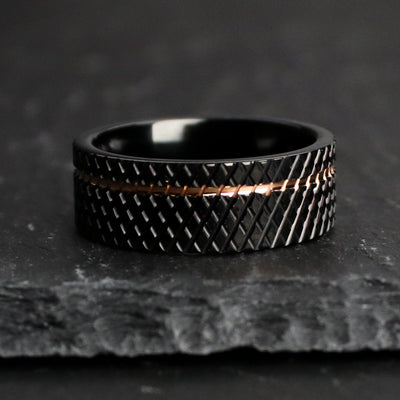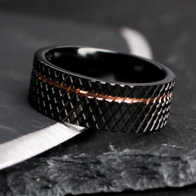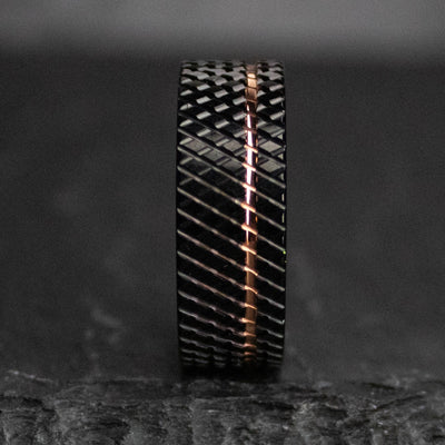 This brutalist men's wedding band features a black knurled exterior, with an offset rose gold inlay.