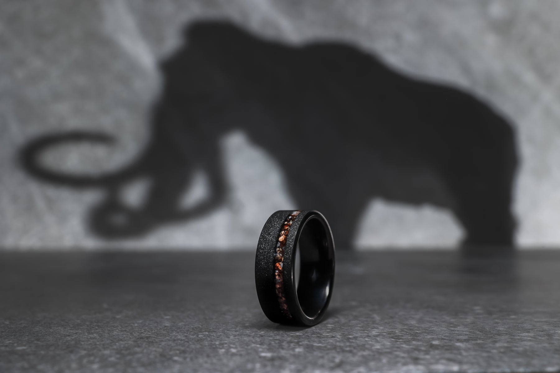 The truly awesome centerpiece of this remarkable ring is a genuine fragment of woolly mammoth bone, carefully harvested from the frozen depths of time. Aged at circa 12,000-300,000 years old, each ring is truly - one of a kind.