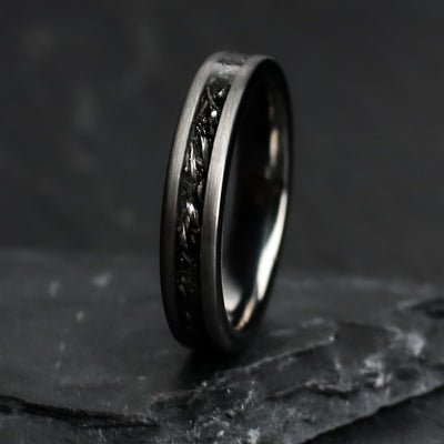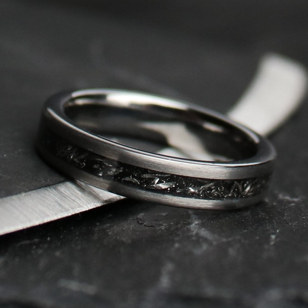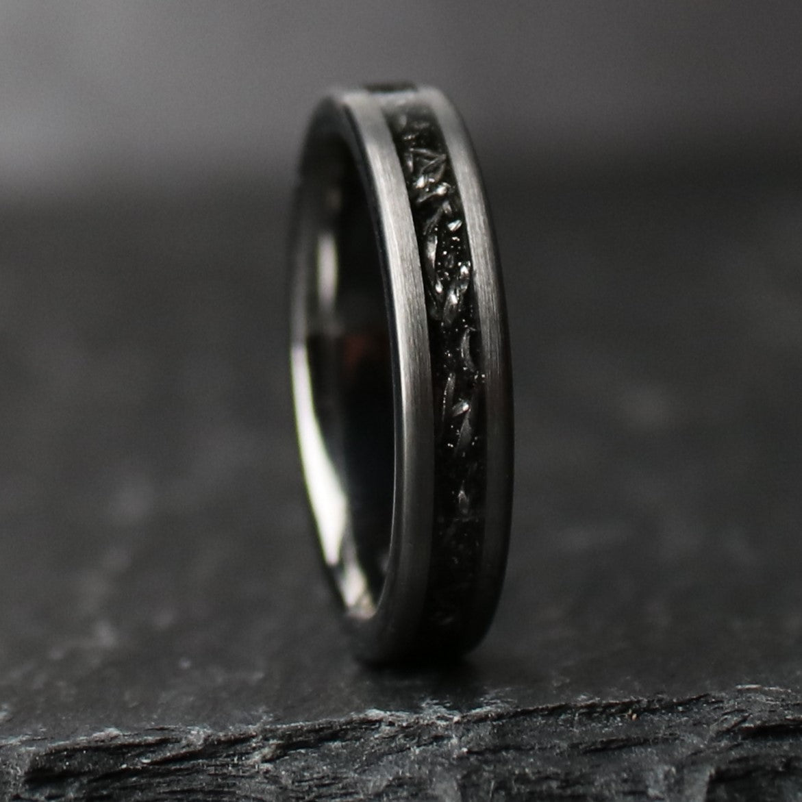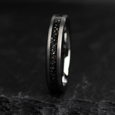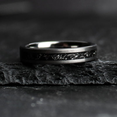 This wedding ring design features a centered Gibeon meteorite inlay, which is forged out of Tungsten Carbide. We exclusively use authentic meteorite in every ring. The Iron filings are milled out of a large block of Gibeon meteorite, and then set for the inlay. It creates an entirely unique aesthetic. Brushed Tungsten Carbide gives a powerful modern aesthetic to the ring design.
