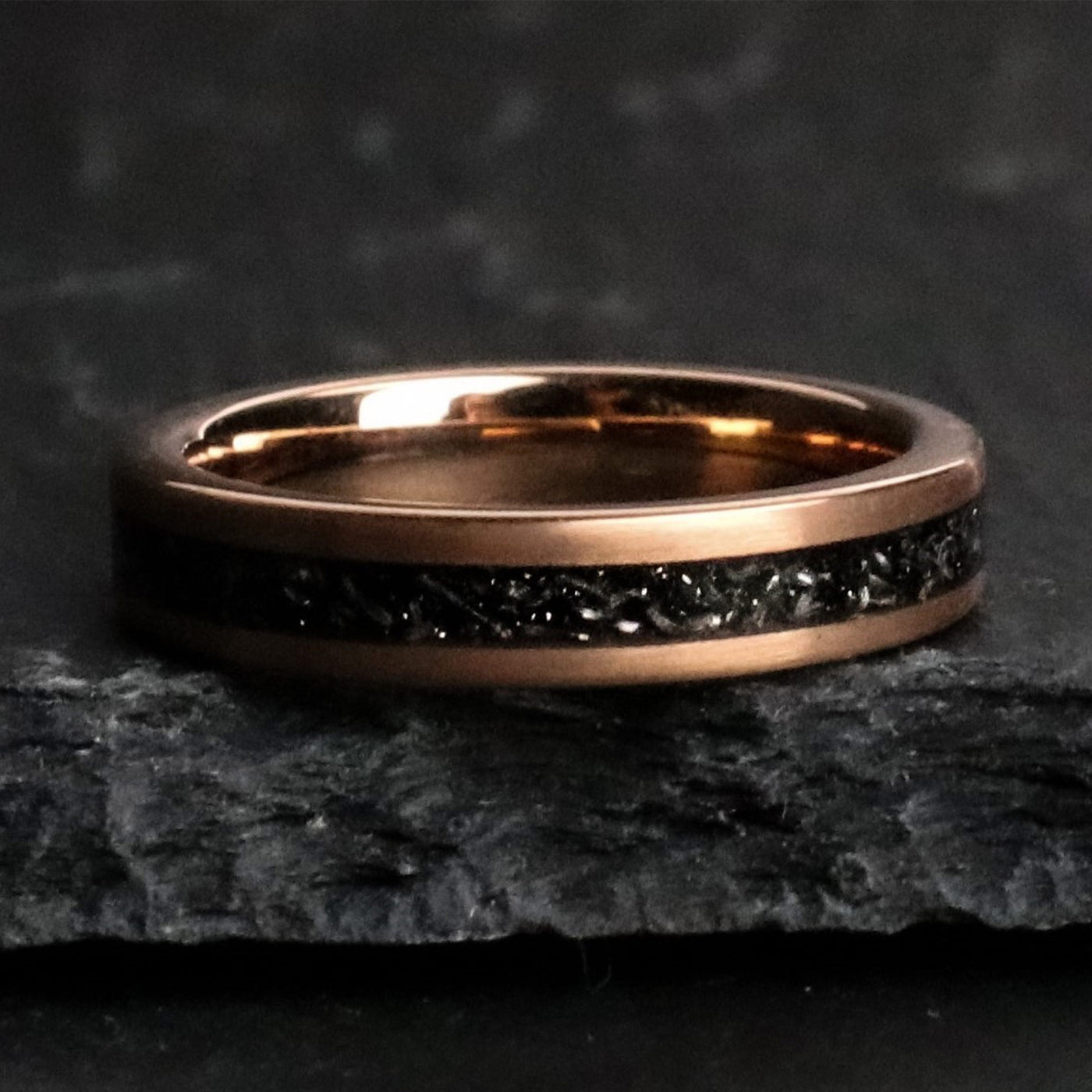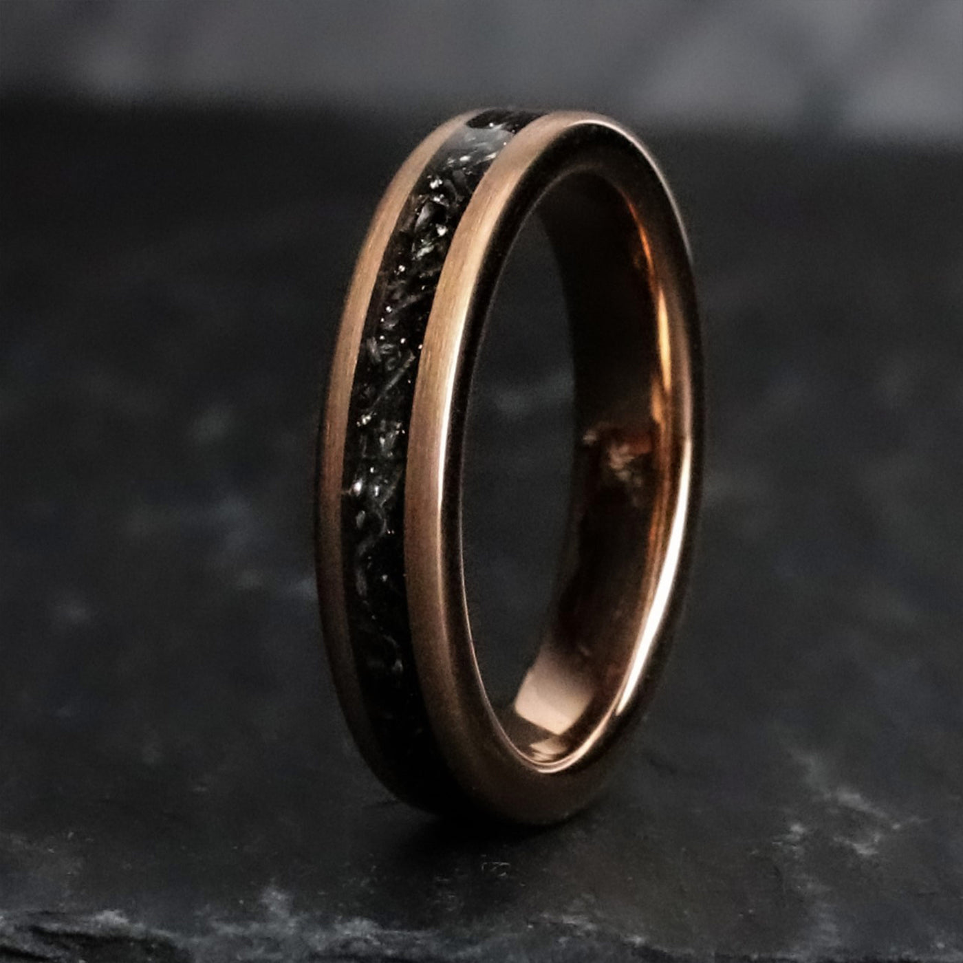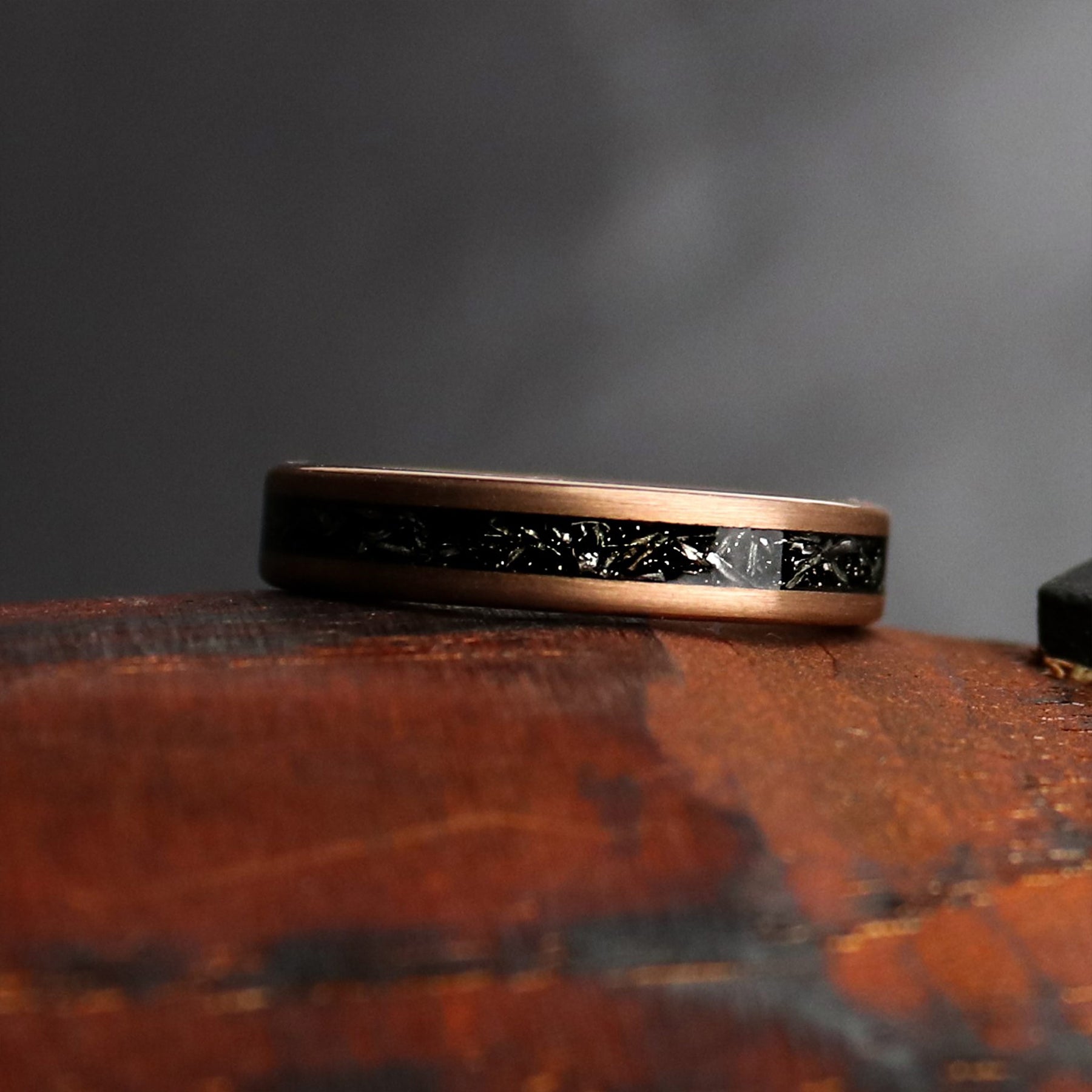 Rose Gold Tungsten compliments the natural meteorite for a modern, minimalist aesthetic.