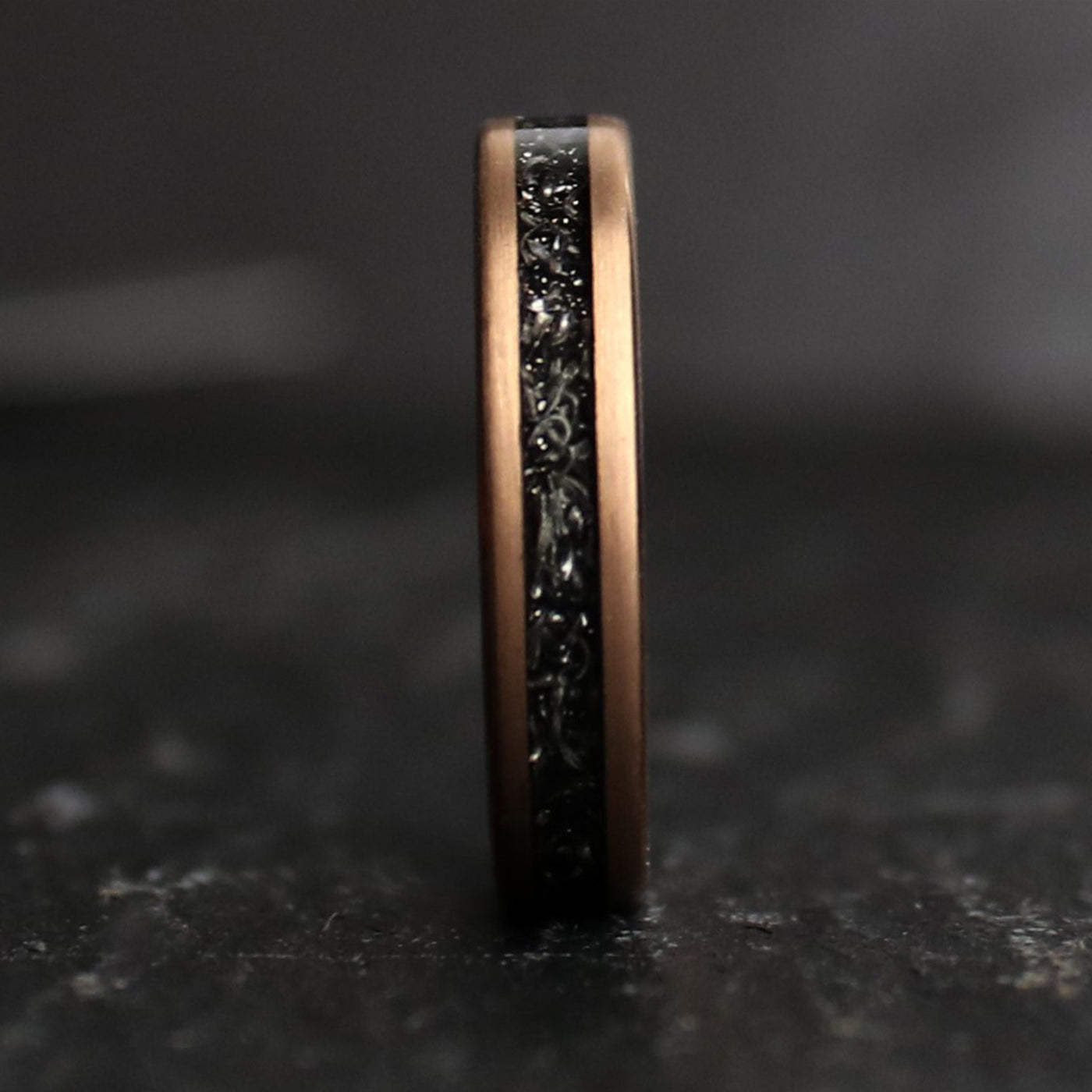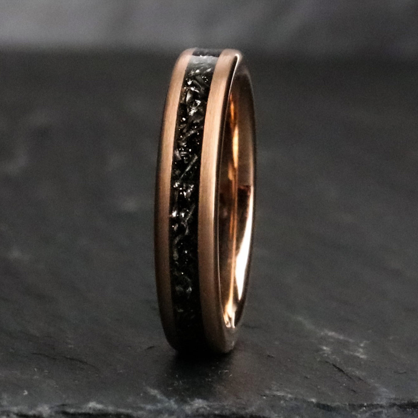 This unique wedding band consists of Gibeon Meteorite inlaid into 18k Rose Gold Tungsten Carbide.