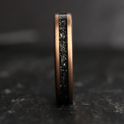 Raw meteorite is surfaced on a mill, and the shavings are captured with a magnet to be inlaid into this unique band.
