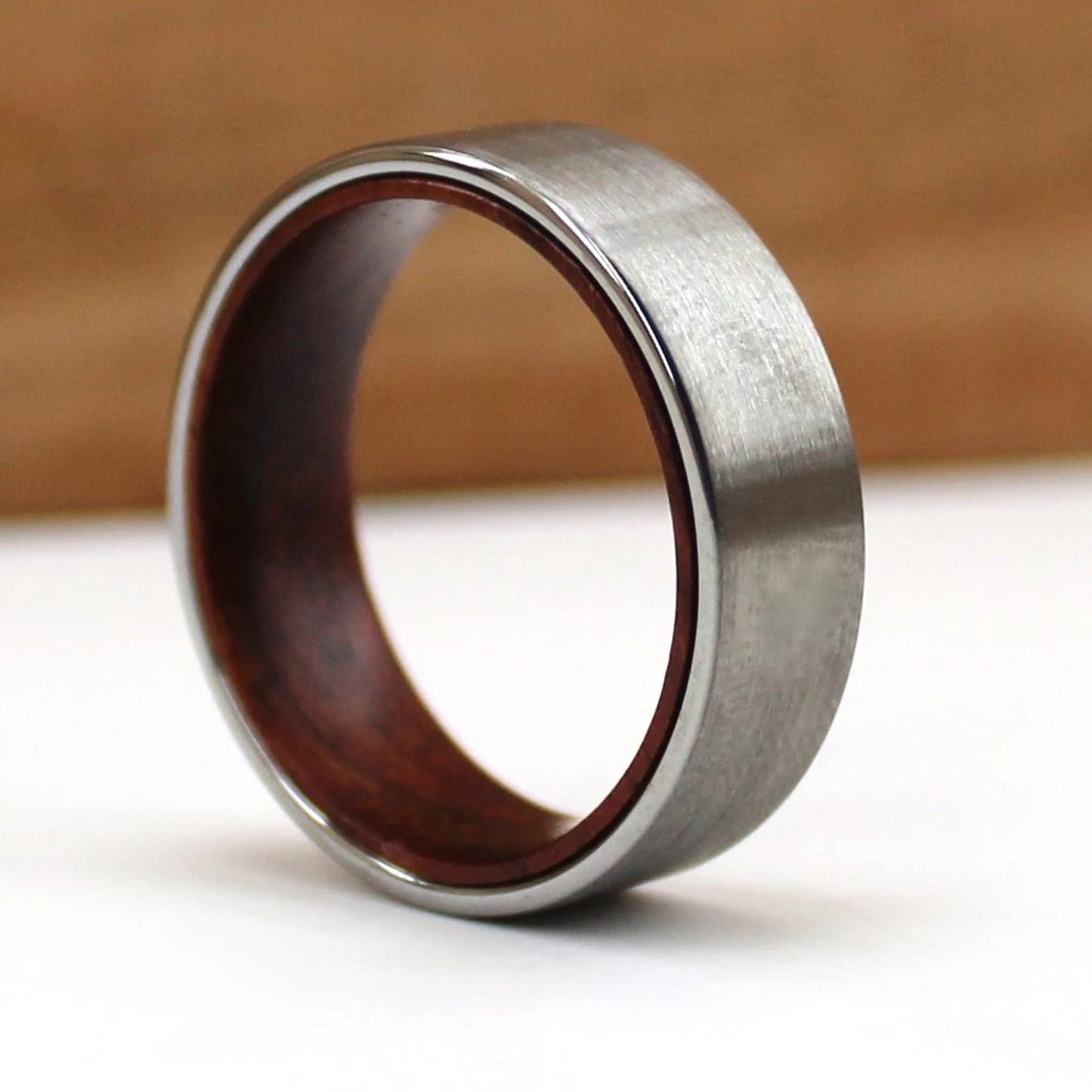 This design features a Redwood liner and Matte Finished Tungsten Exterior. 7 mm width is pictured in this listing.