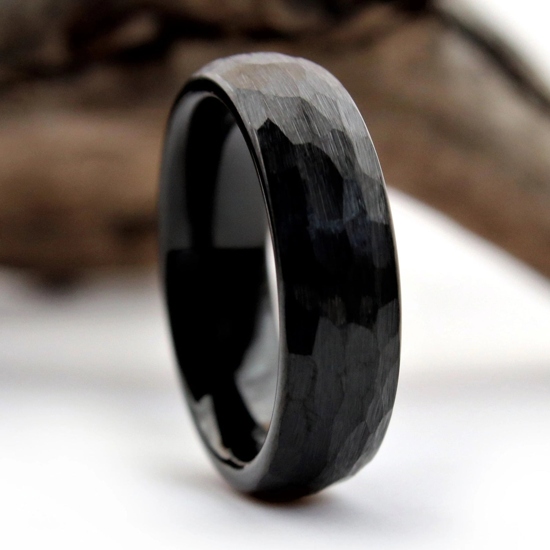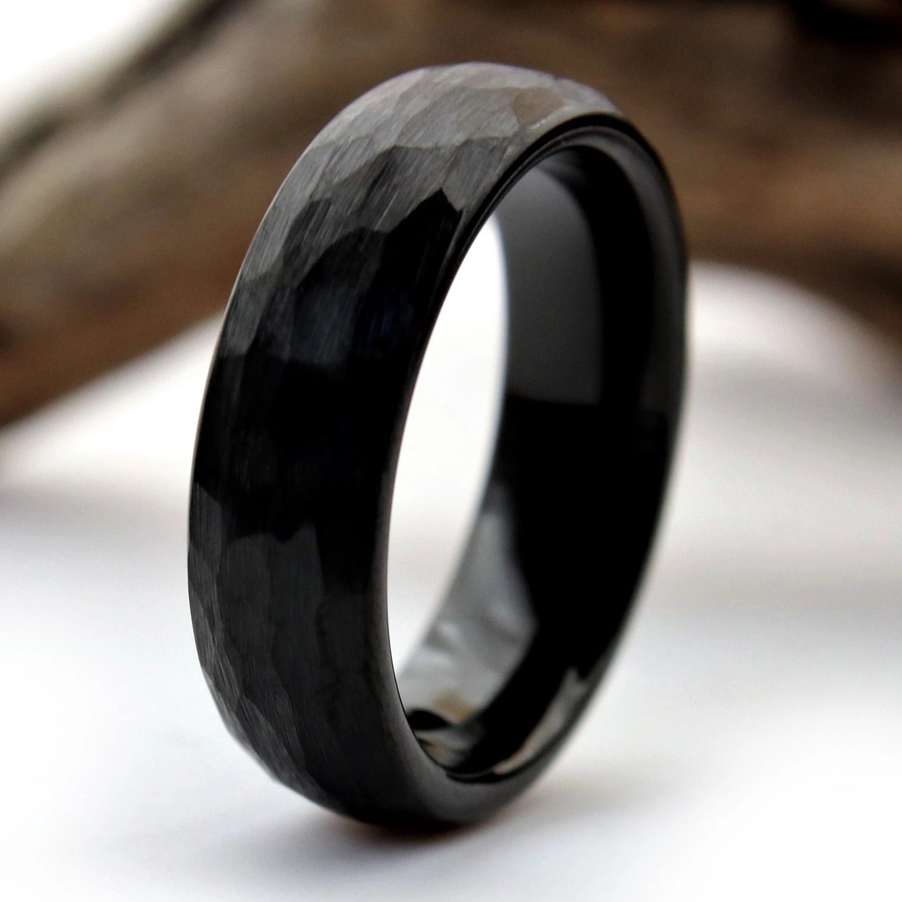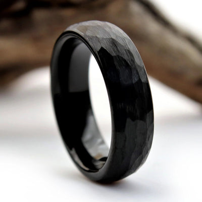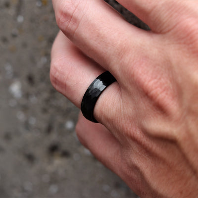 This unique wedding ring features a black hammered exterior, and a polished black interior.