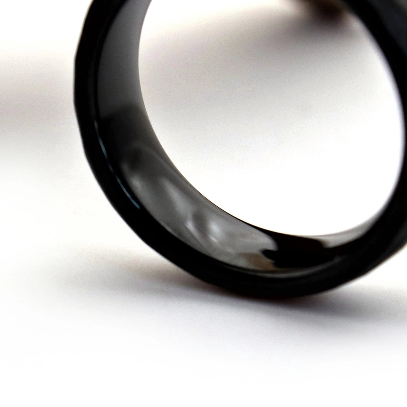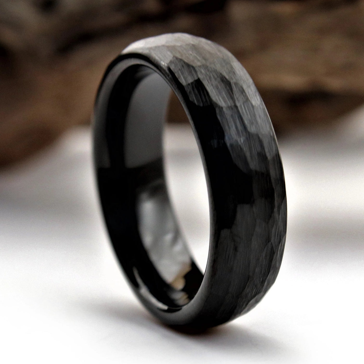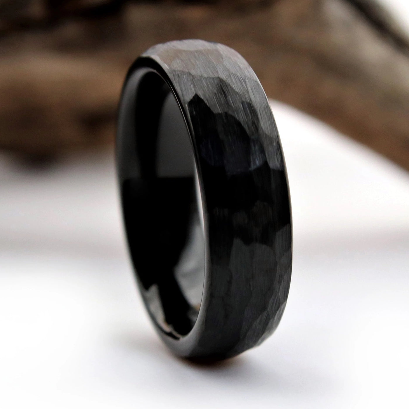 This unique wedding ring features a black hammered exterior, and a polished black interior.