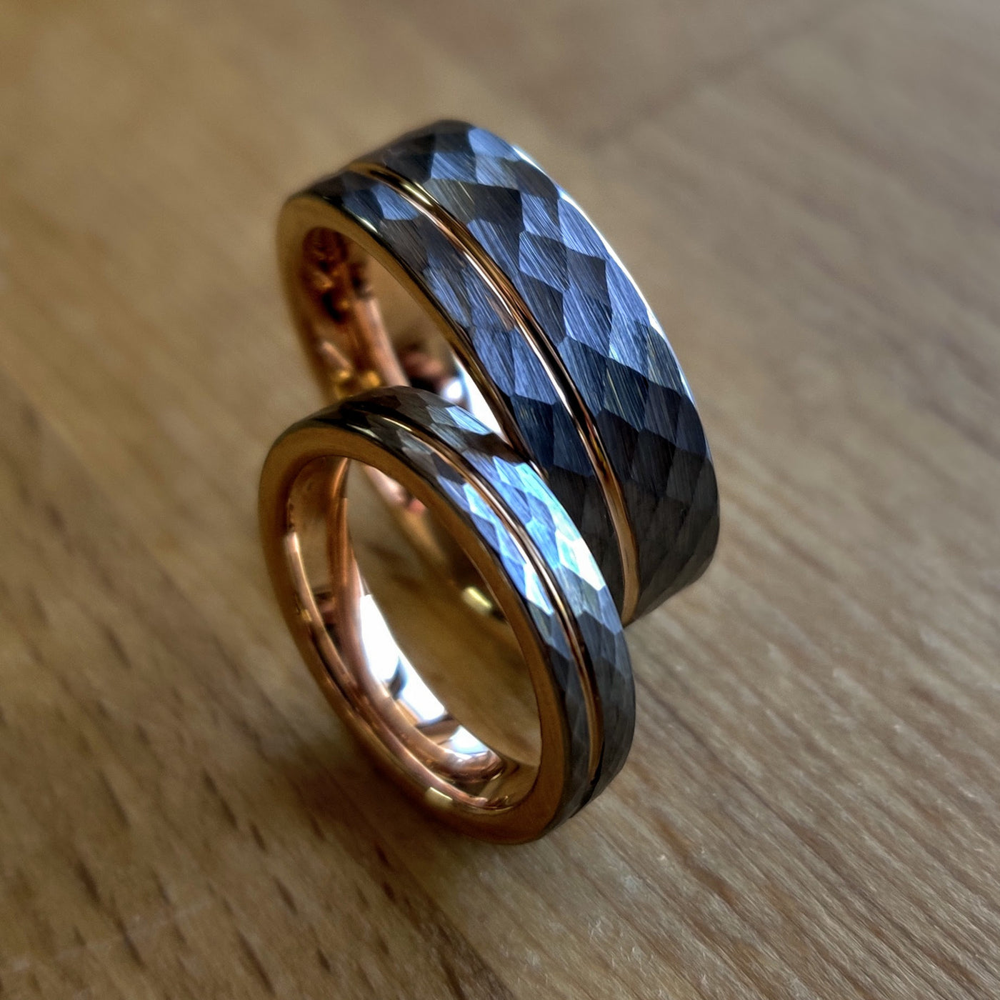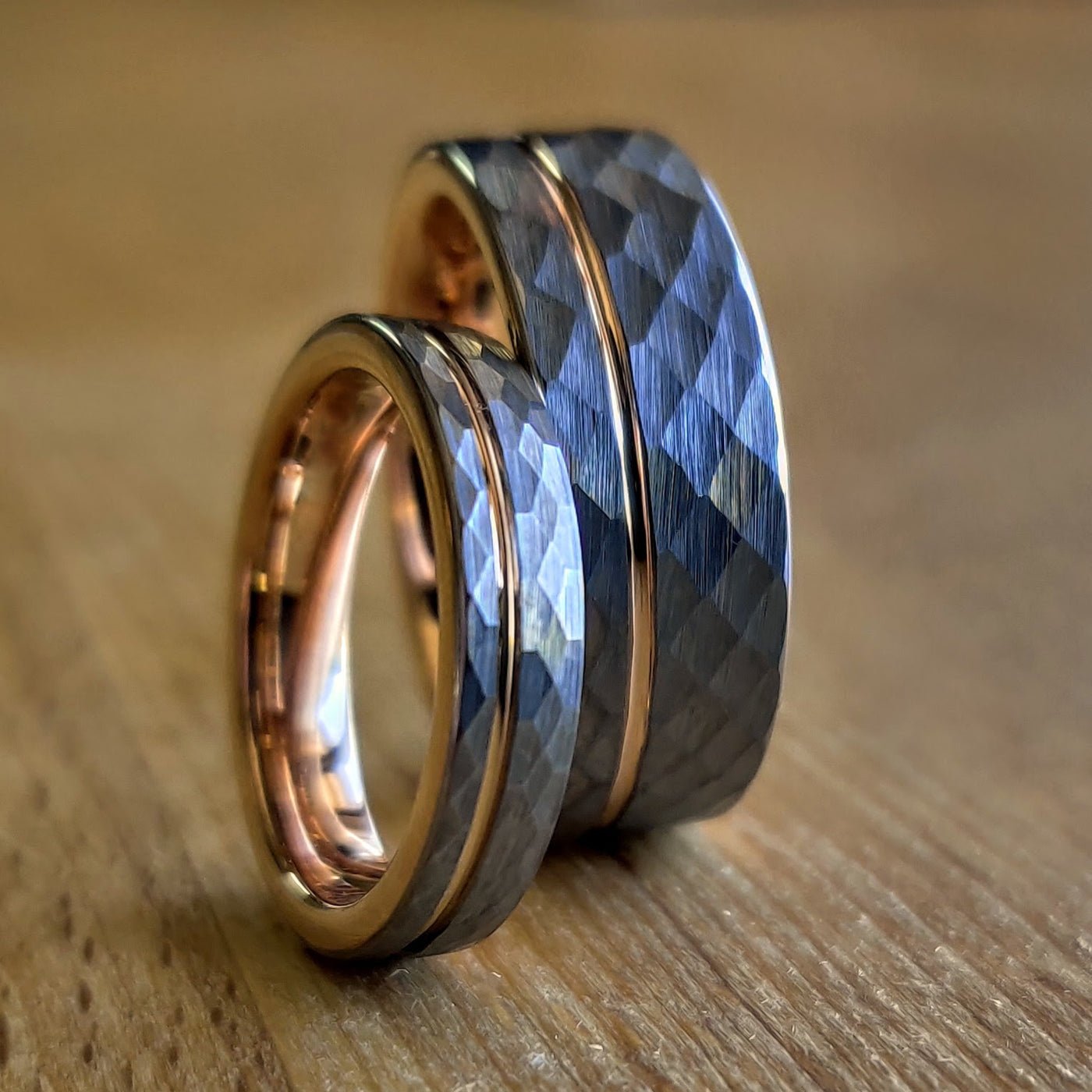 This design is perfect as engagement rings, wedding rings, promise rings, or for any occasion. The design pairs a rustic, hammered, gray tungsten carbide exterior, with a rose gold inlay, and interior. The rings are forged via sintering in an industrial mold, and I polish it with diamond paste.