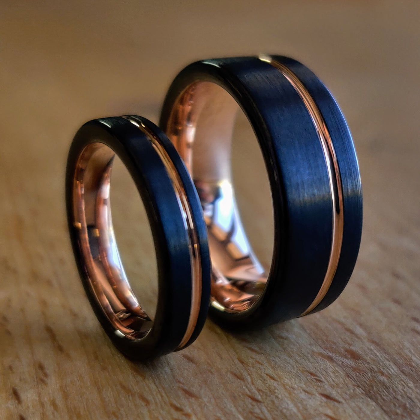 This gold ring set features a black tungsten carbide exterior, with a rose gold anodized titanium interior and inlay. It's perfect as a wedding ring set, engagement ring set, or for any occasion. The design is simple, modern, and requires no maintenance.