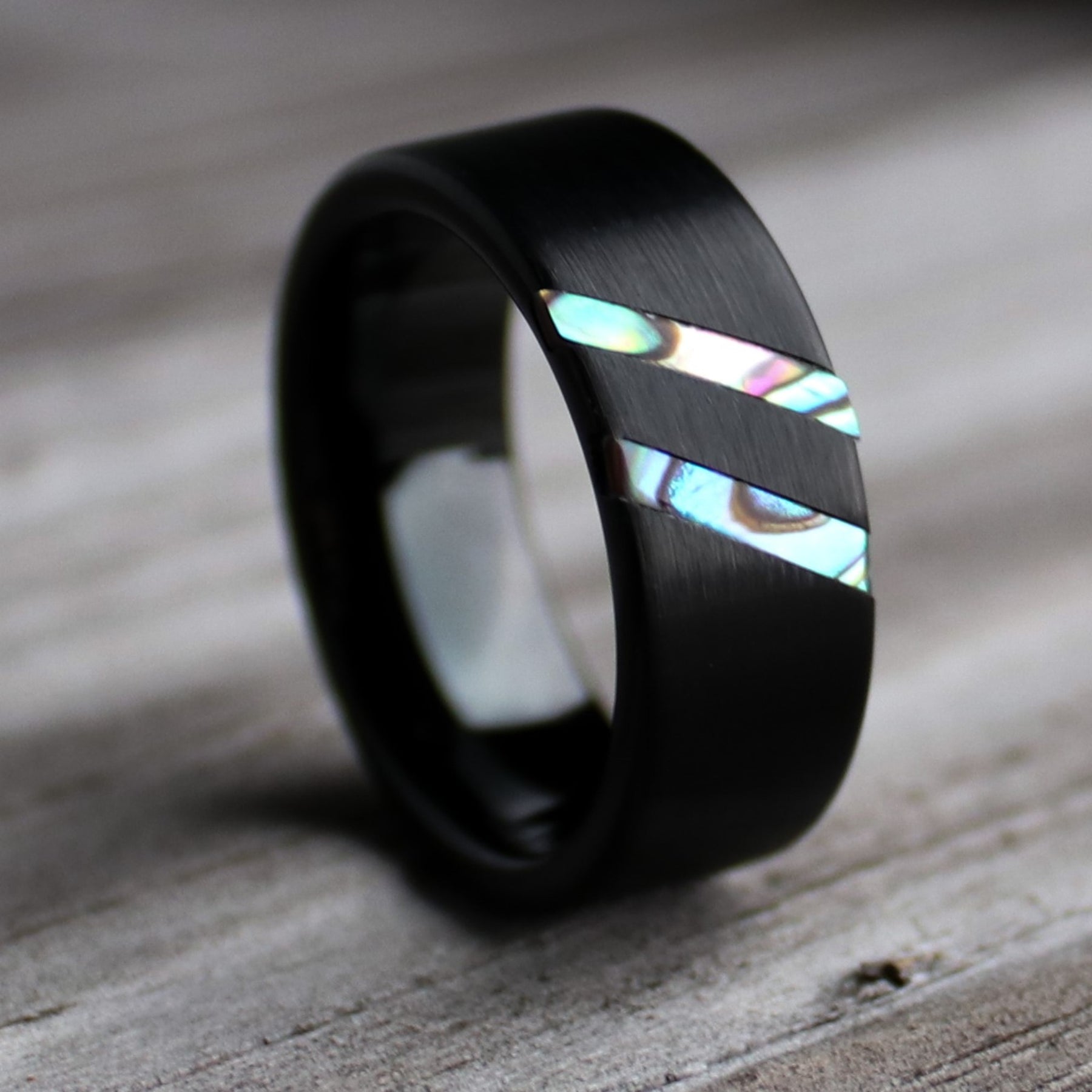 Whether you're a scuba diver, fisherman, or you simply long for the sea - we made this wedding band for you. Black Tungsten Carbide is paired with two mitred pairs of the Abalone, placed at 45 degrees for a modern aesthetic.