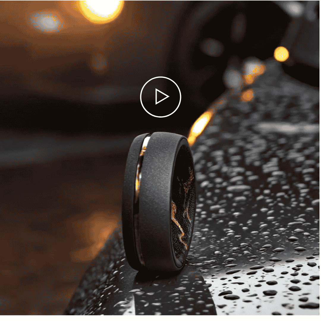 The Monaco is a forged black carbon fiber wedding ring- crafted with formula-one grade 24,000 carbon fiber tow - pressurized with gold epoxy mica (you could even say gold leaf flake, or something akin to that).