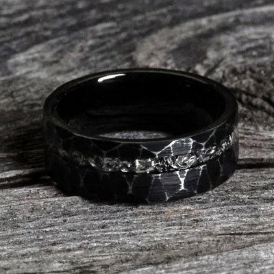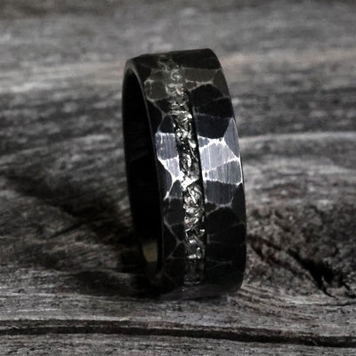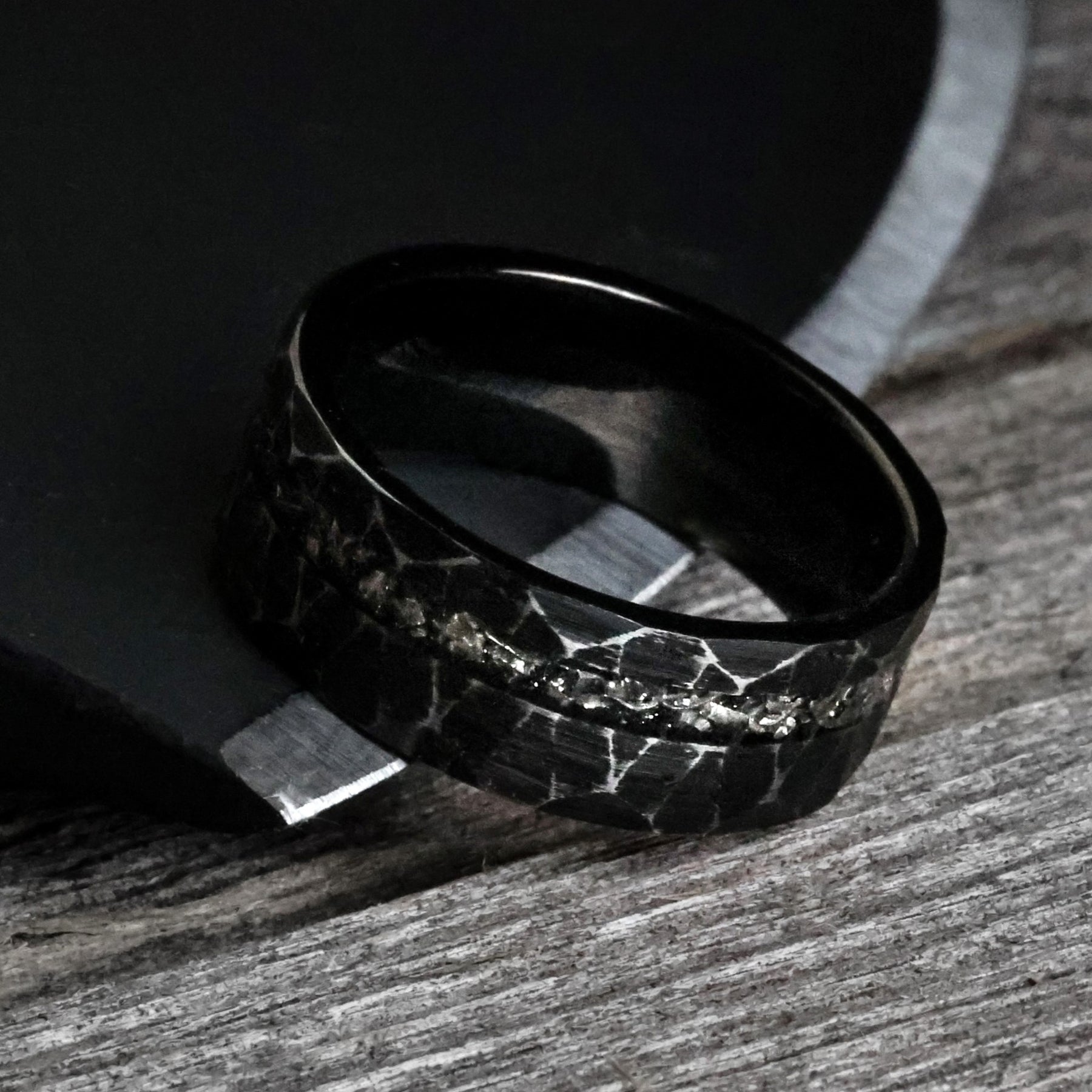 We've given a unique and rugged texture to the exterior of this band, with silver, black facets complimenting the dark Iron and nickel tone of the meteorite.