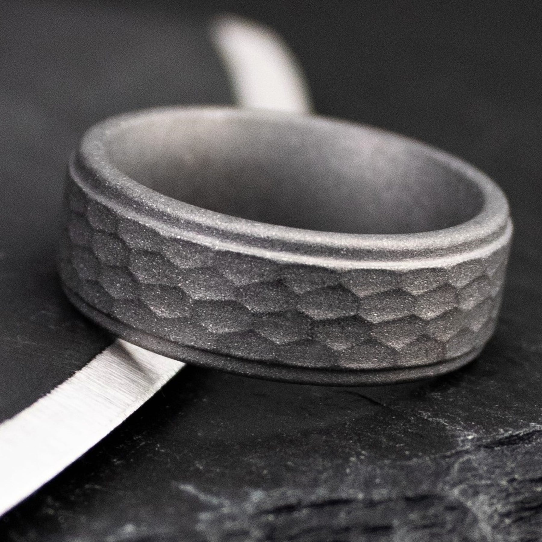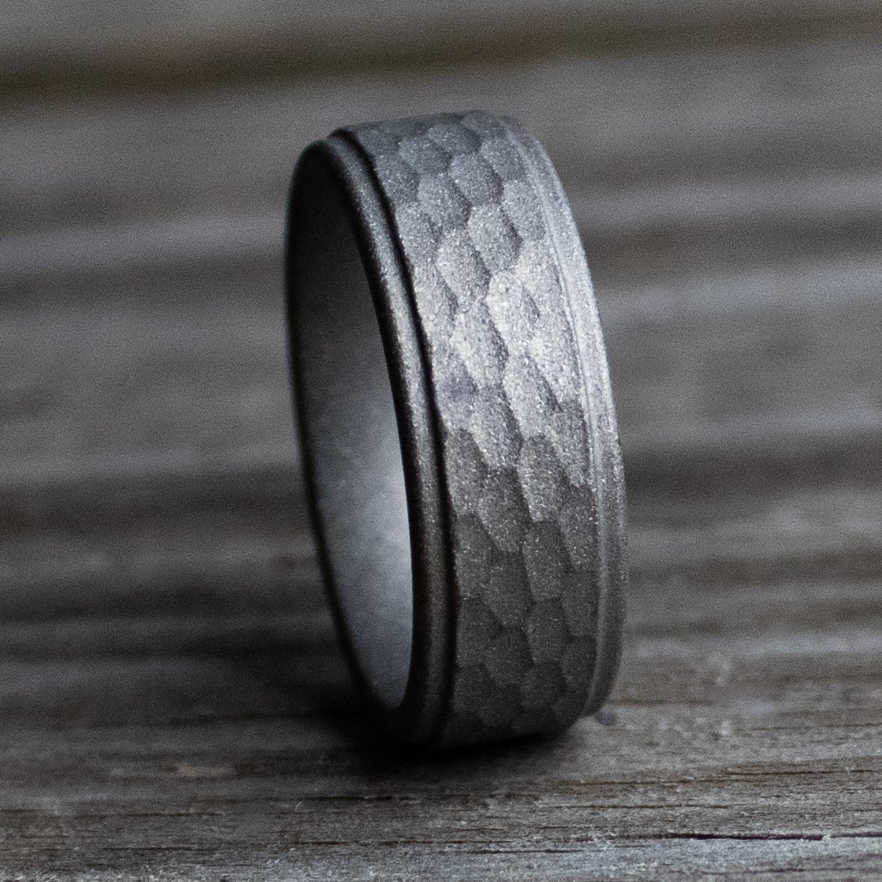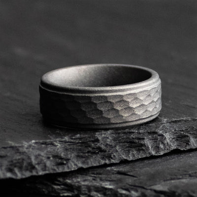 This sandblasted gray men's wedding band is made from the hardest, most durable metal in existence: Tungsten Carbide. With its hammered and beveled exterior, it boasts a hard, gray, matte finish. Each ring is designed in lost wax casting, and sintered in industrial molds. I polish and sandblast the exterior, and interior with aluminum oxide for a rustic, hardy feel.