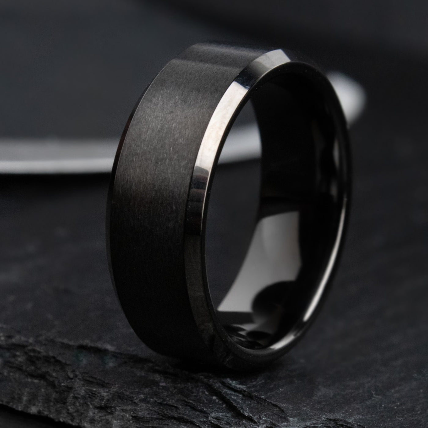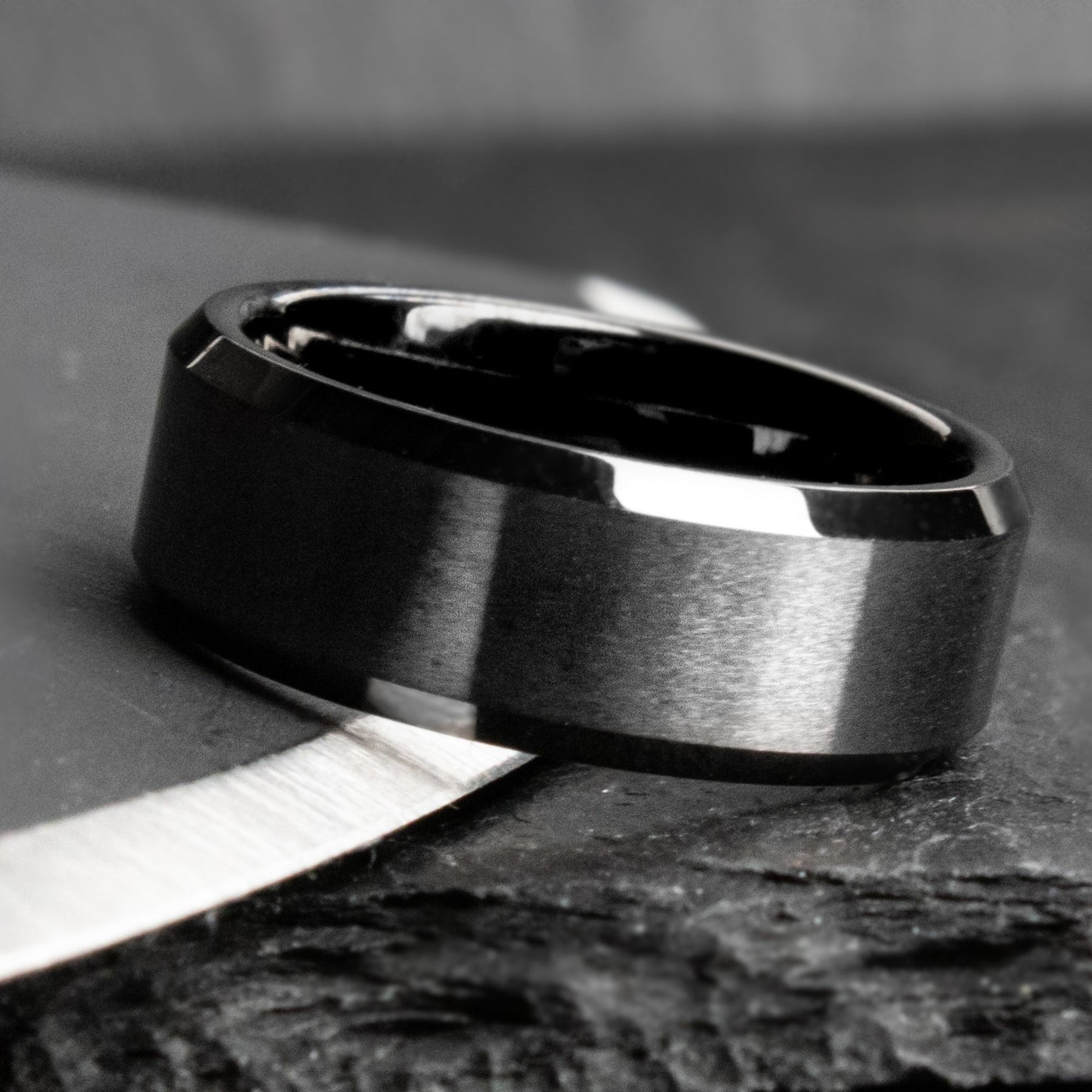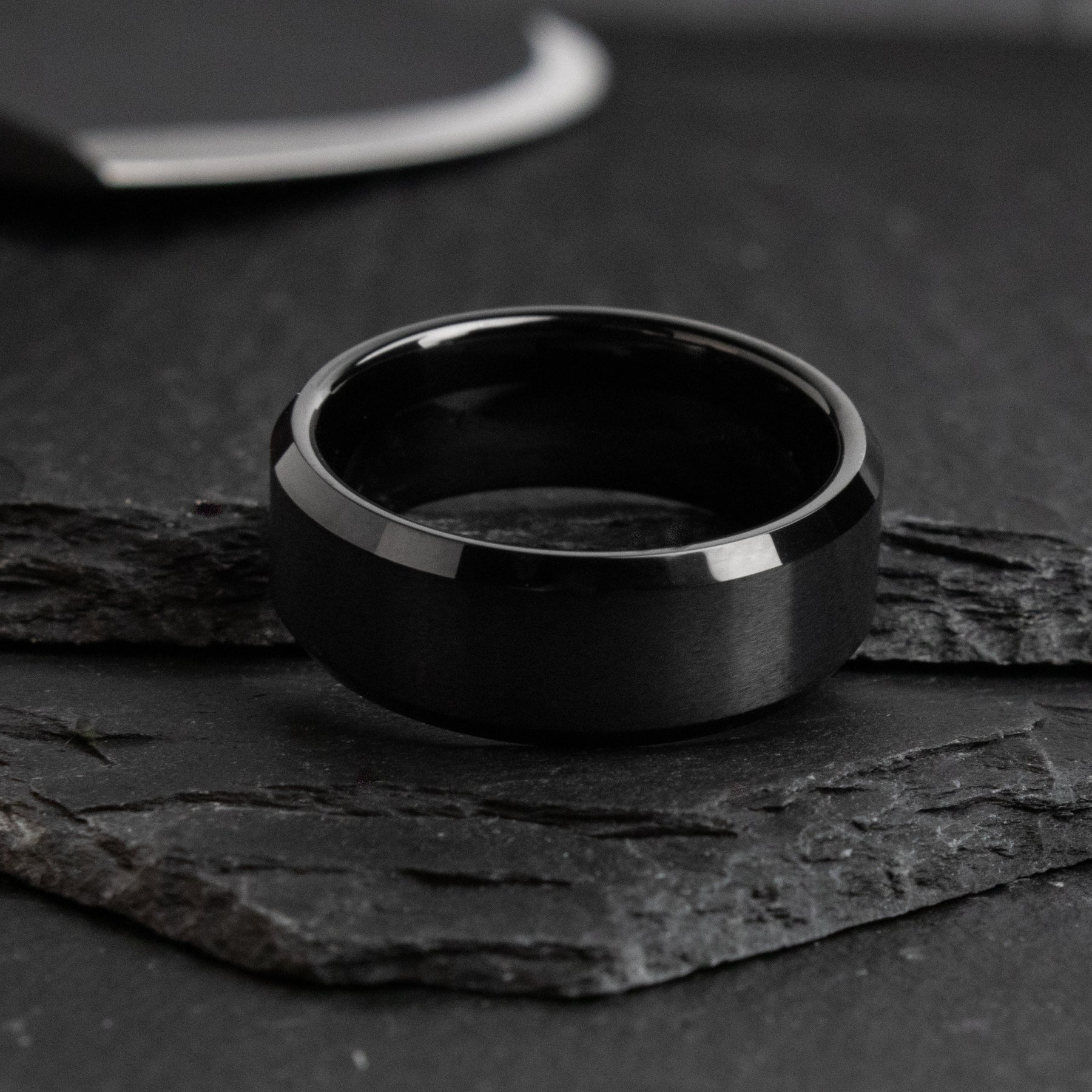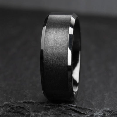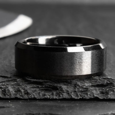Tungsten Carbide is the paragon of modern metal working. The interior and chamfers of this design are polished, whereas the front profile is brushed.