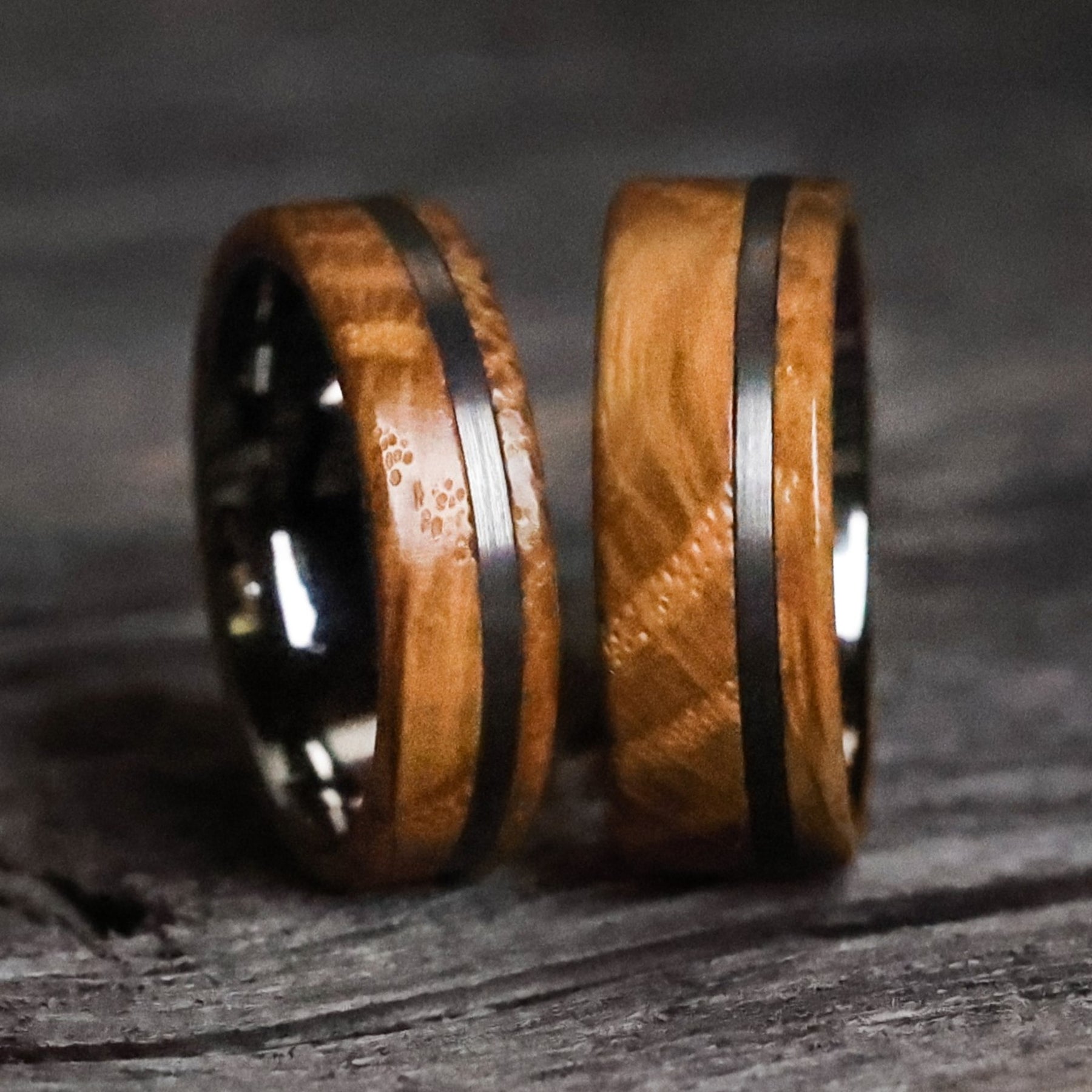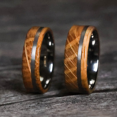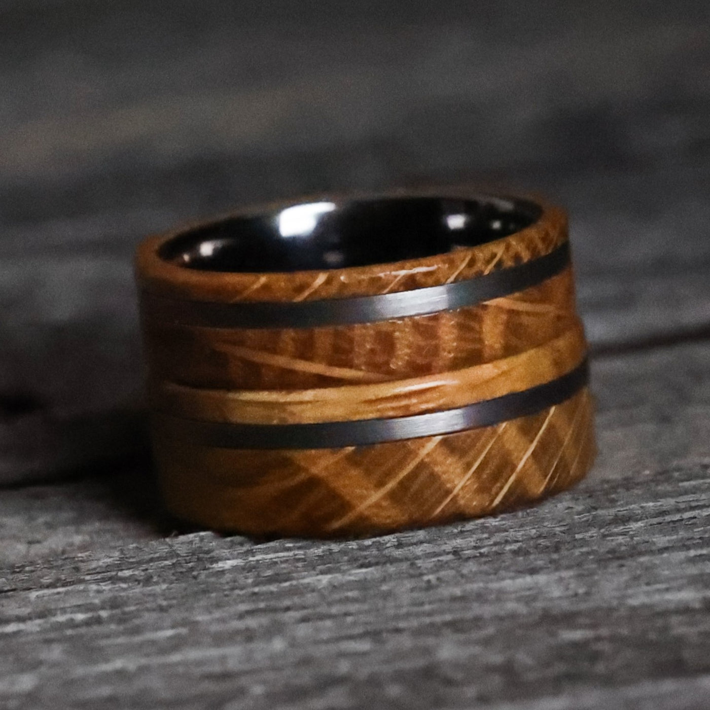 The whiskey barrel timber flows from a deep whiskey brown, through light tan sapwood. The bands are complimented by a hardened Tungsten Carbide core.