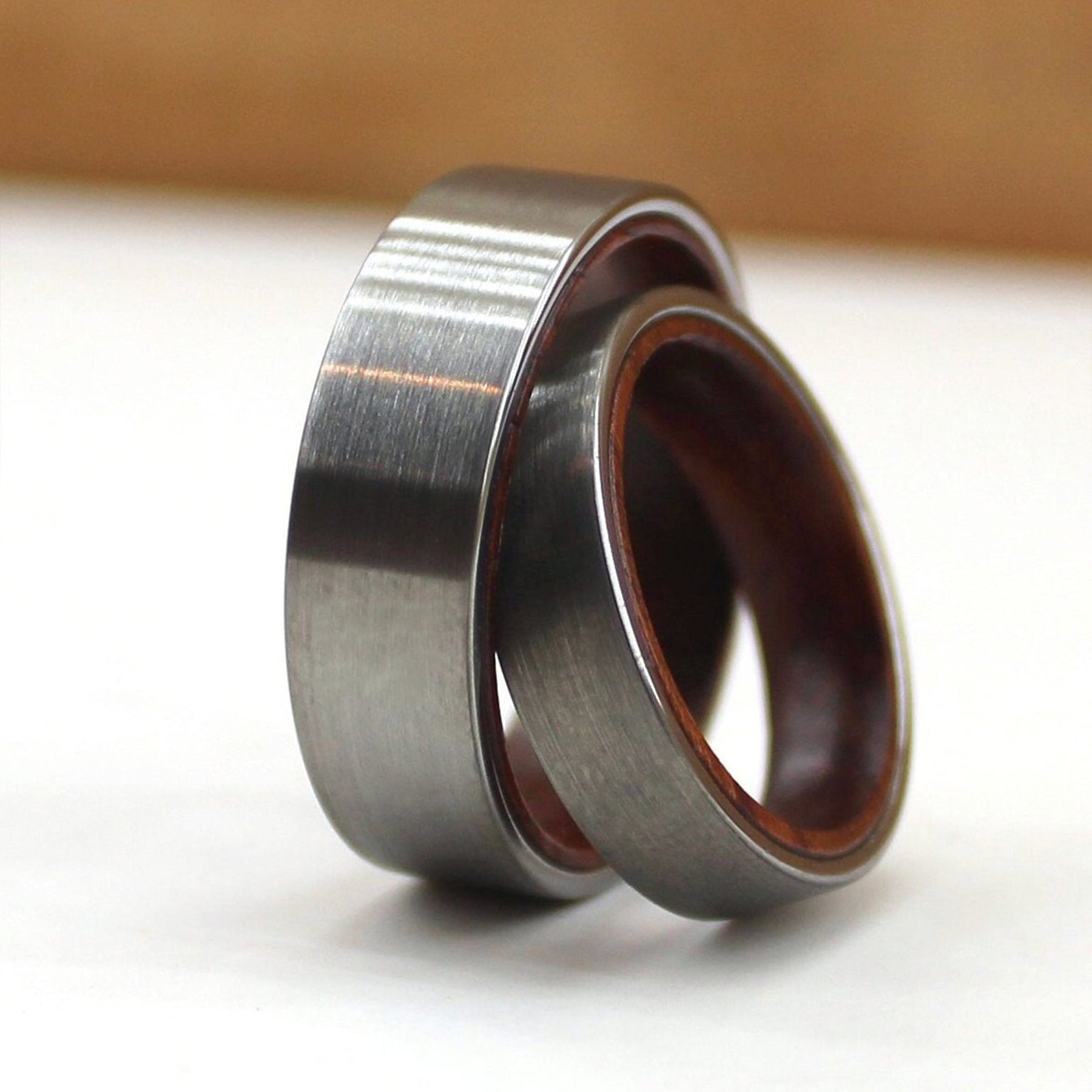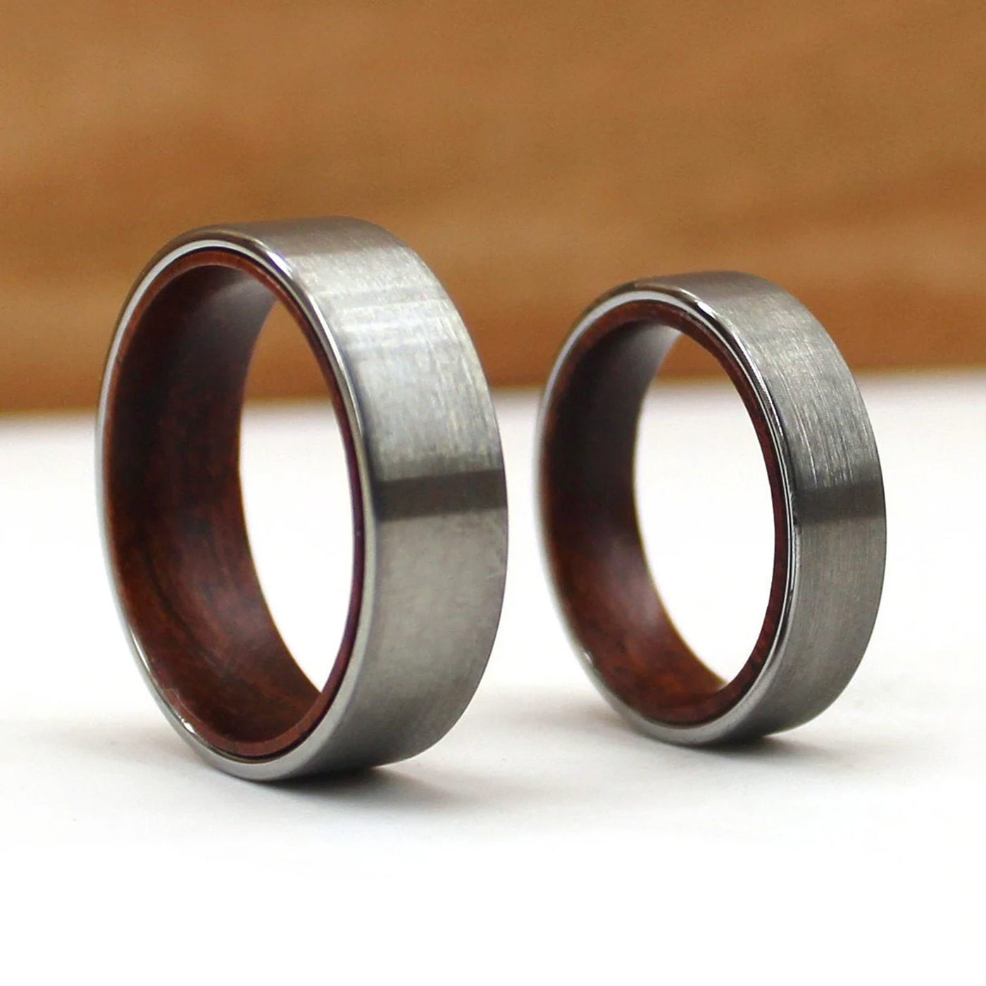 This men's and women's matching wedding ring set features a silver Tungsten matte finish exterior and California Redwood interior.