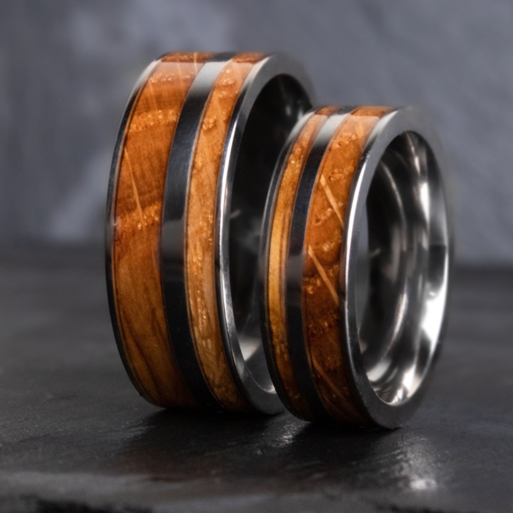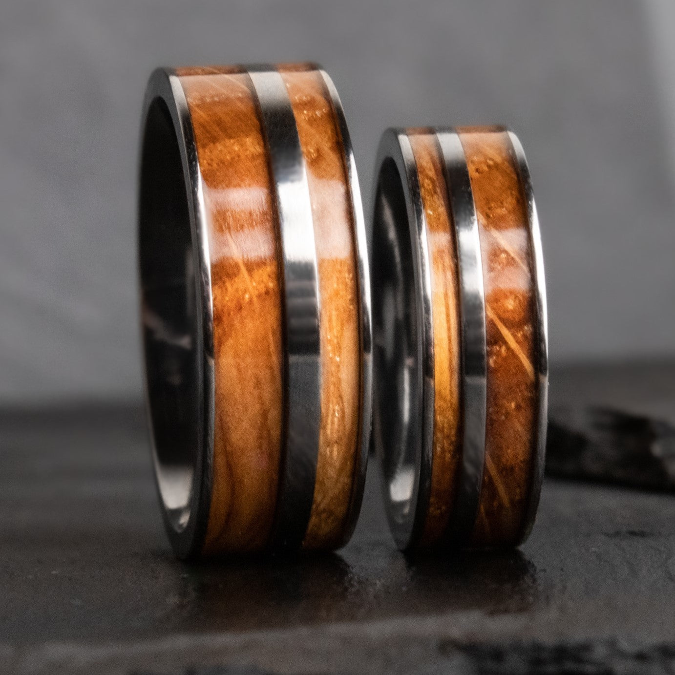 This design is perfect as an engagement ring set, promise ring set, wedding ring set, or for any occasion. Old growth Oak is set into grooved Titanium, and sealed in marine grade epoxy, to make an entirely waterproof design.
