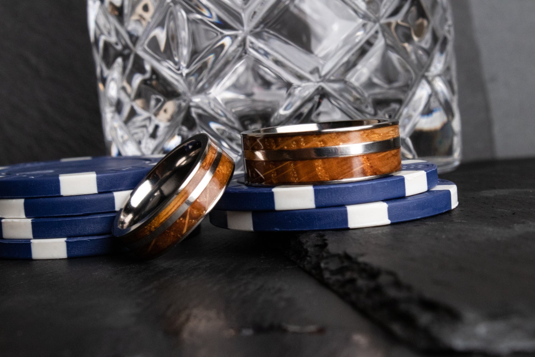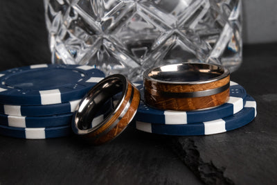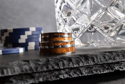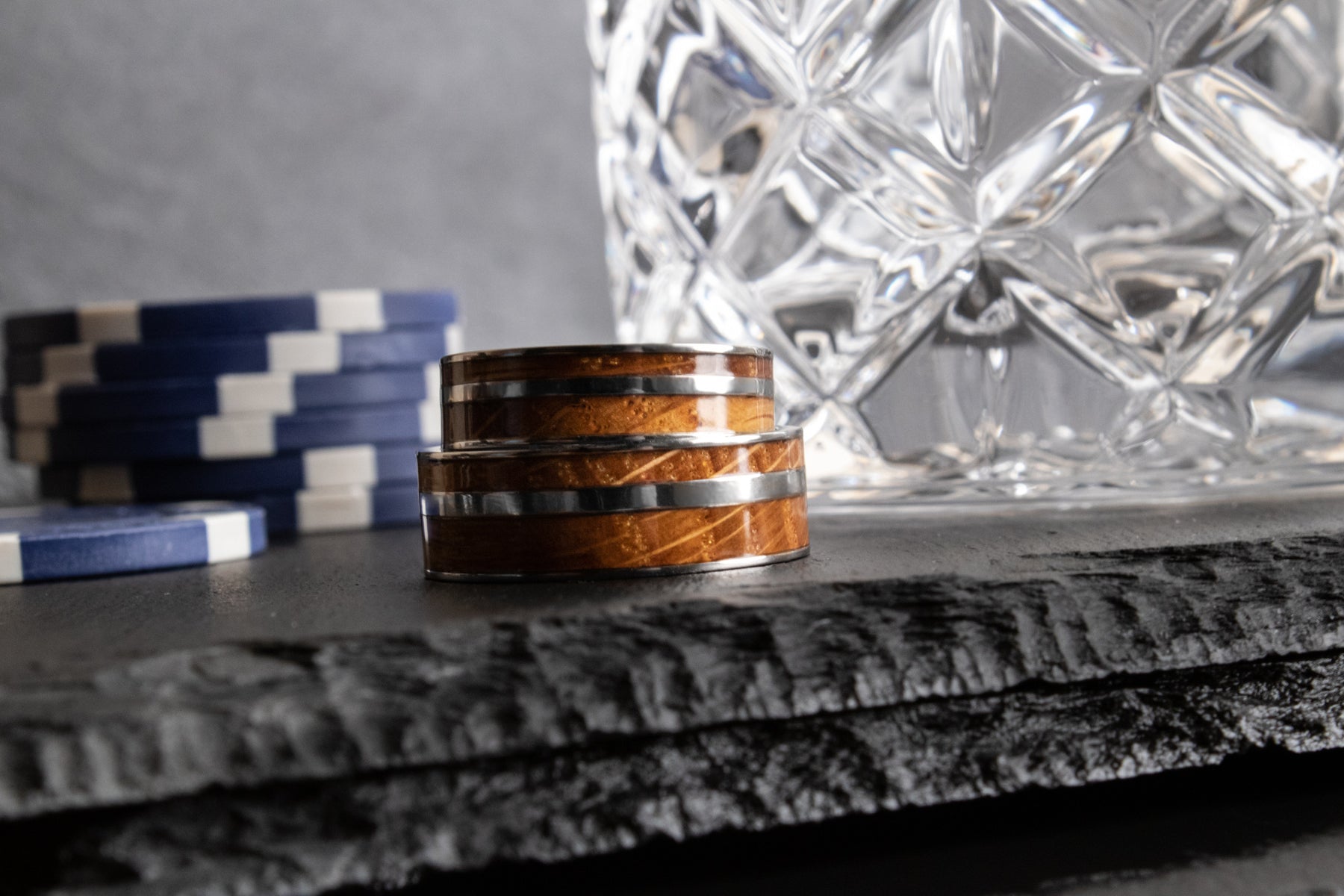 Jack Daniel's whiskey barrel is set into an entirely unique Titanium profile in this wedding ring set.