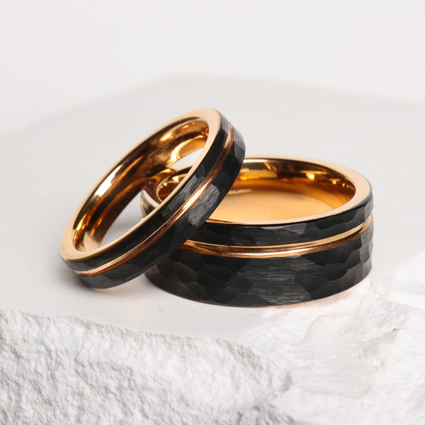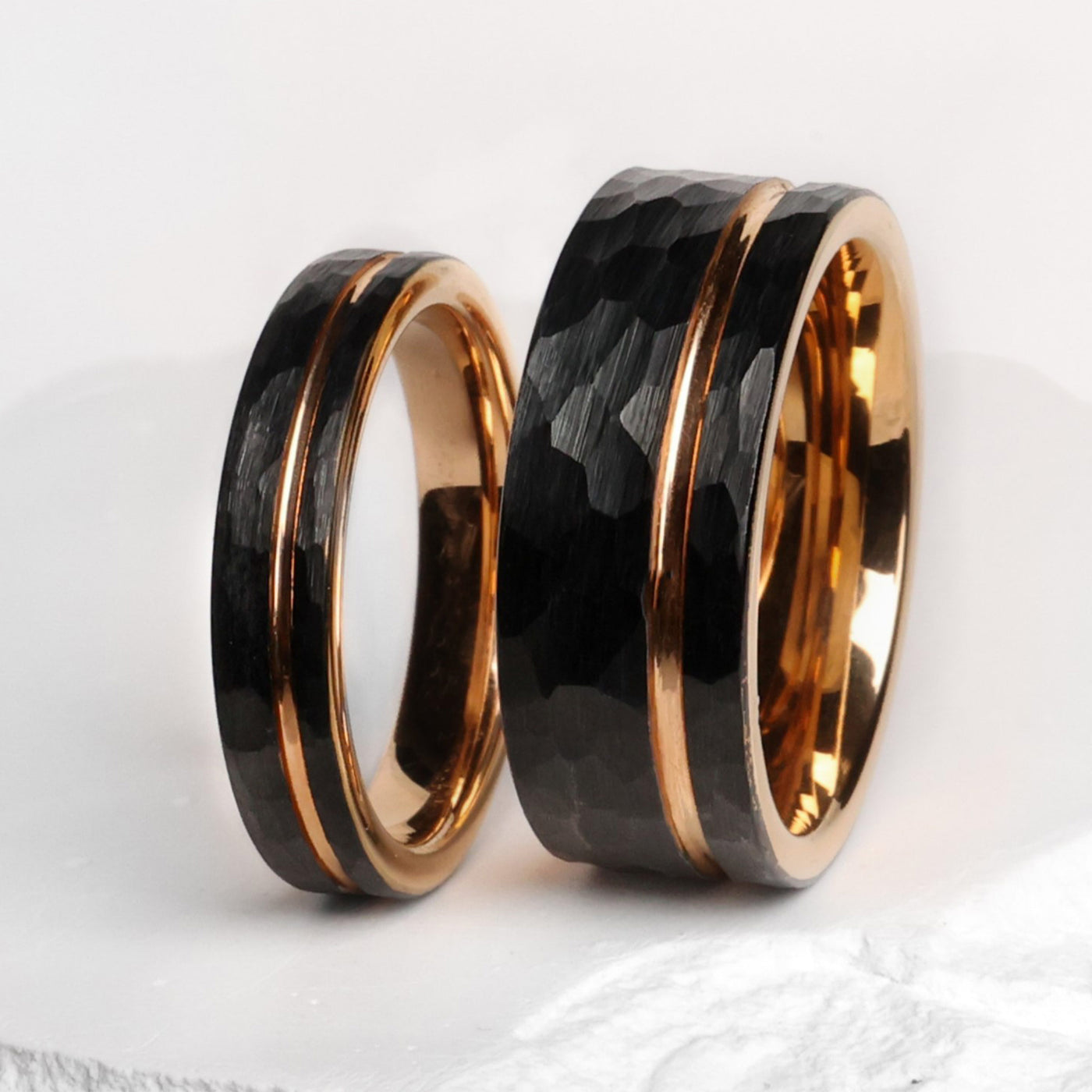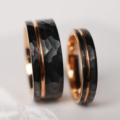 This design is perfect as engagement rings, wedding rings, promise rings, or for any occasion. The design pairs a rustic, hammered, gray tungsten carbide exterior, with a rose gold inlay, and interior. The rings are forged via sintering in an industrial mold, and I polish it with diamond paste.