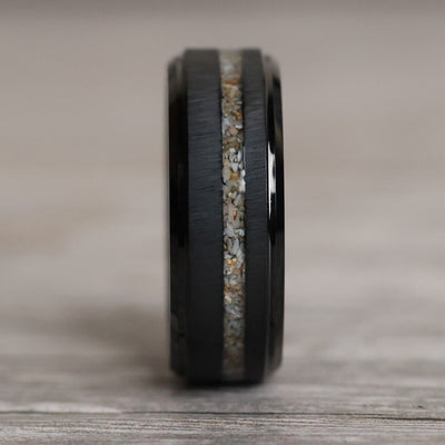 Being history buffs, and fishermen ourselves, we inlaid this wedding band with shark teeth found from the beach.