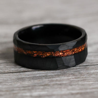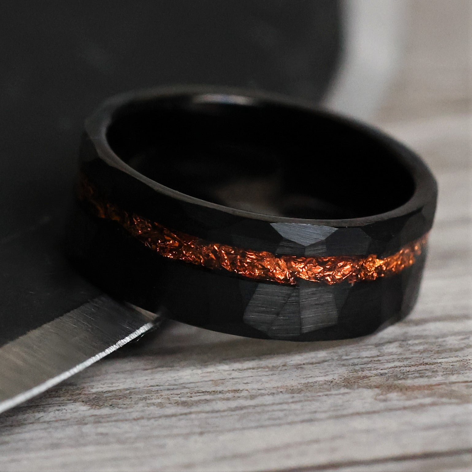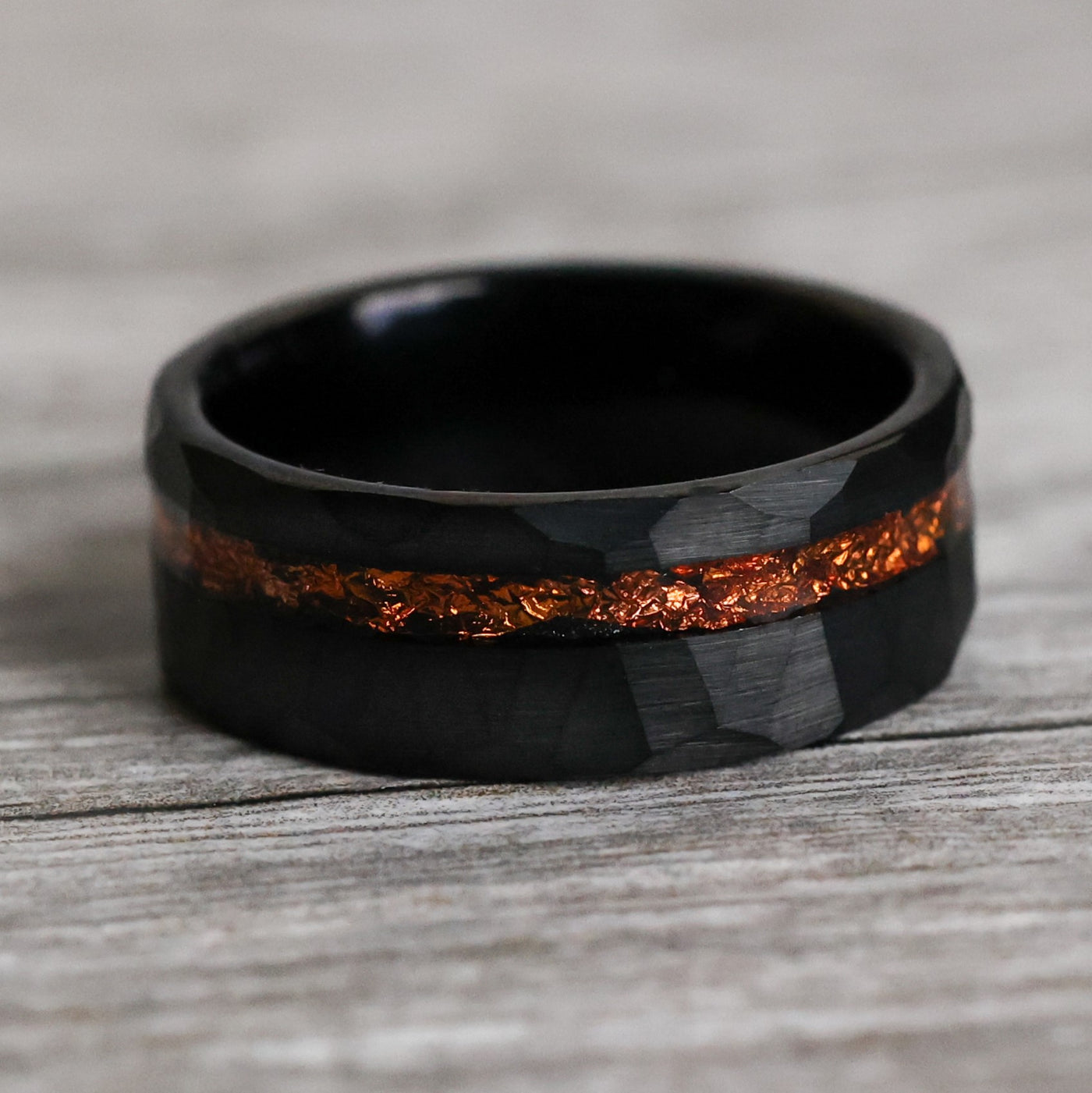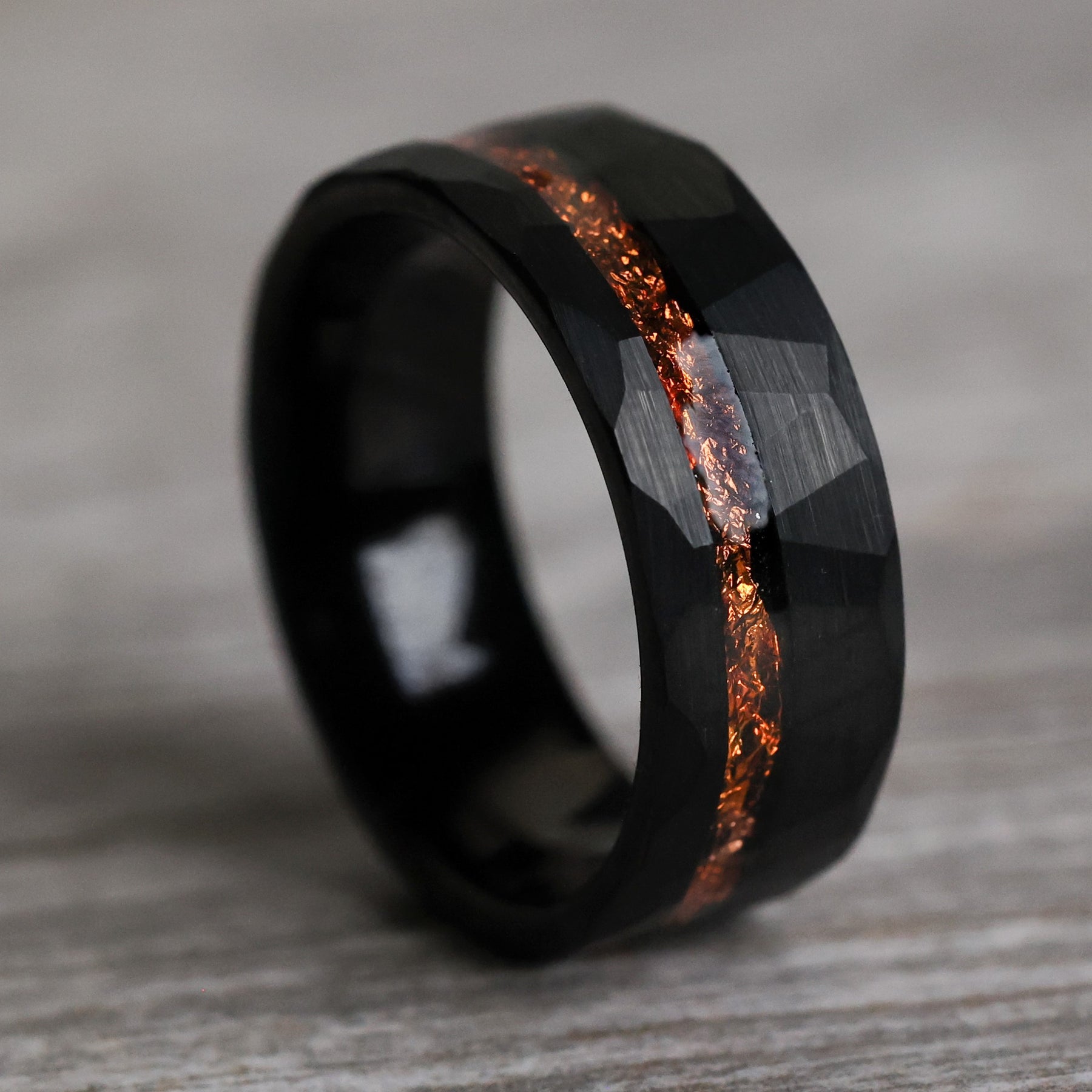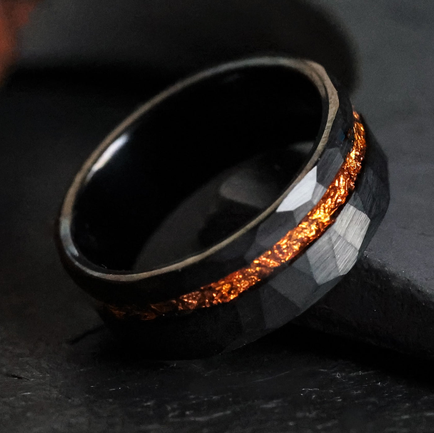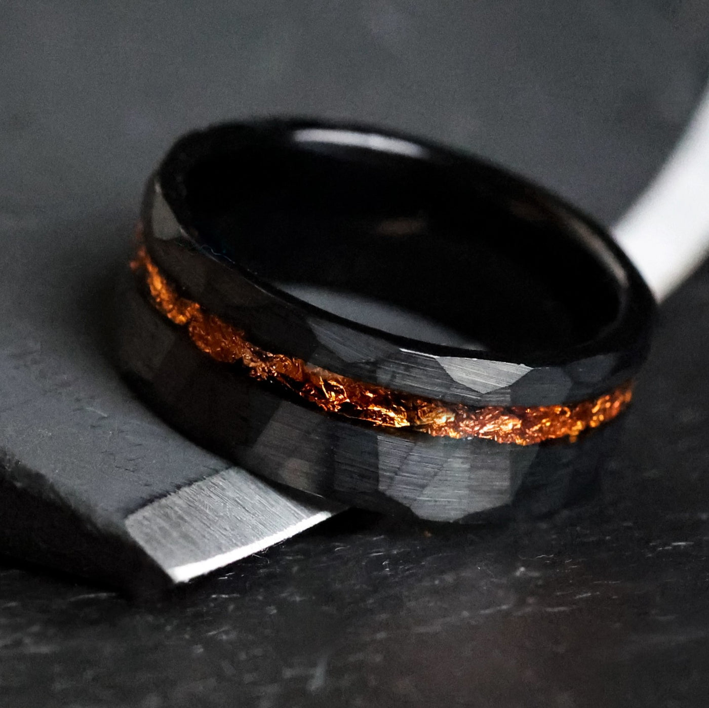 This hammered band was forged from Tungsten Carbide and a vibrant orangey-copper leaf. Black facets mark its surface, giving it a vigorous, modern aesthetic.