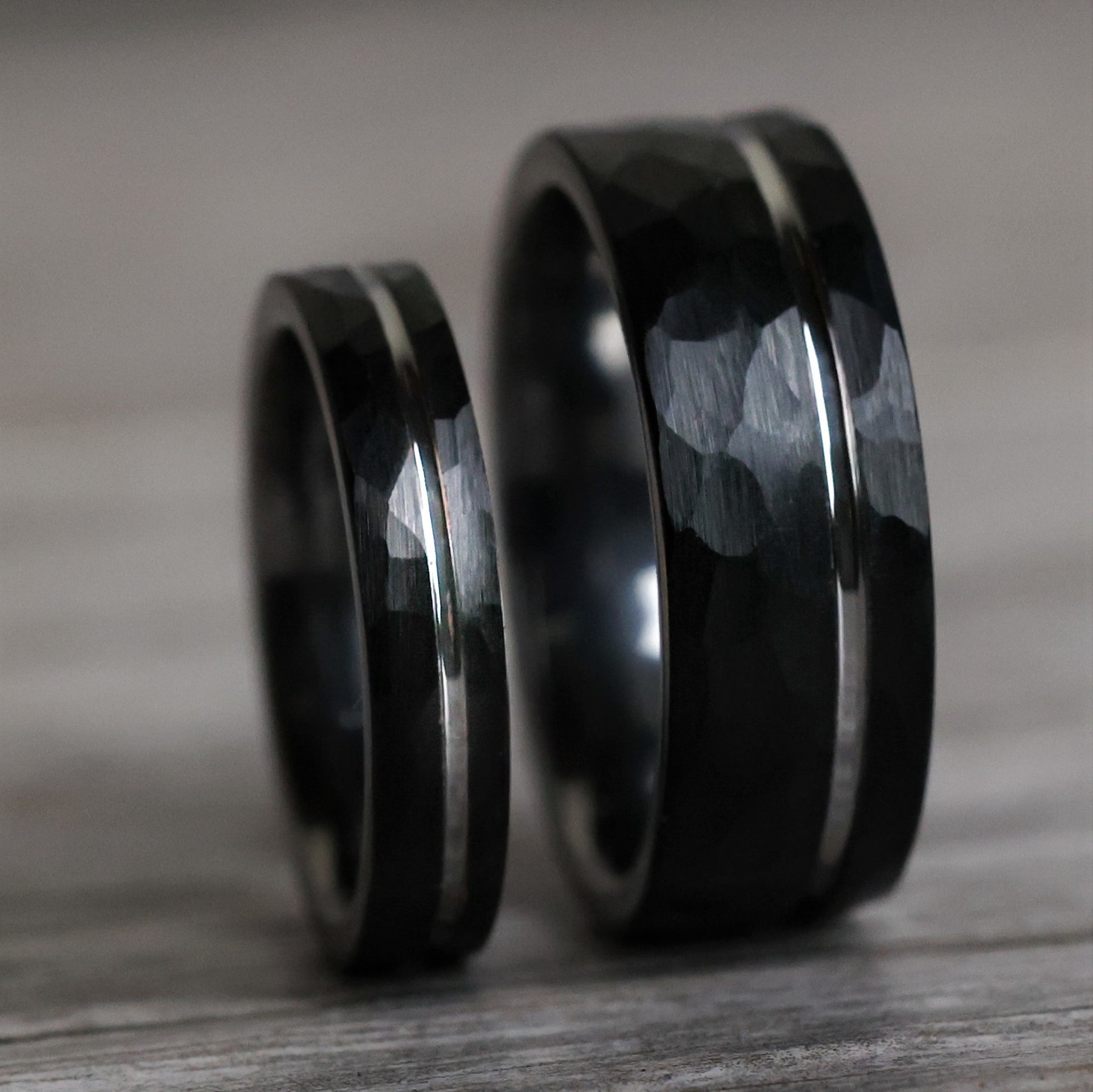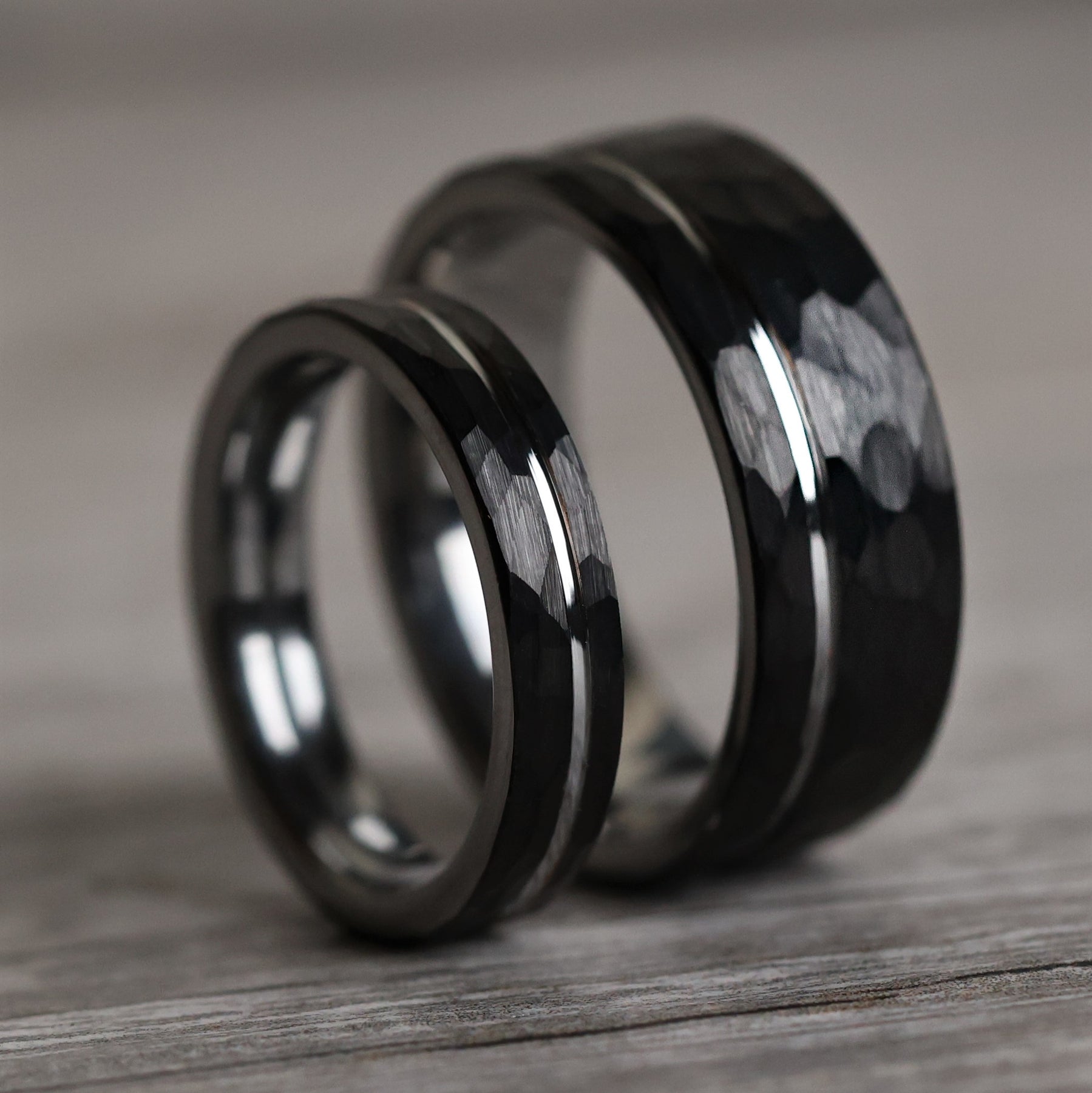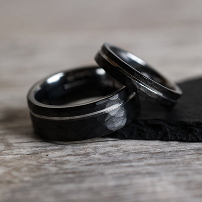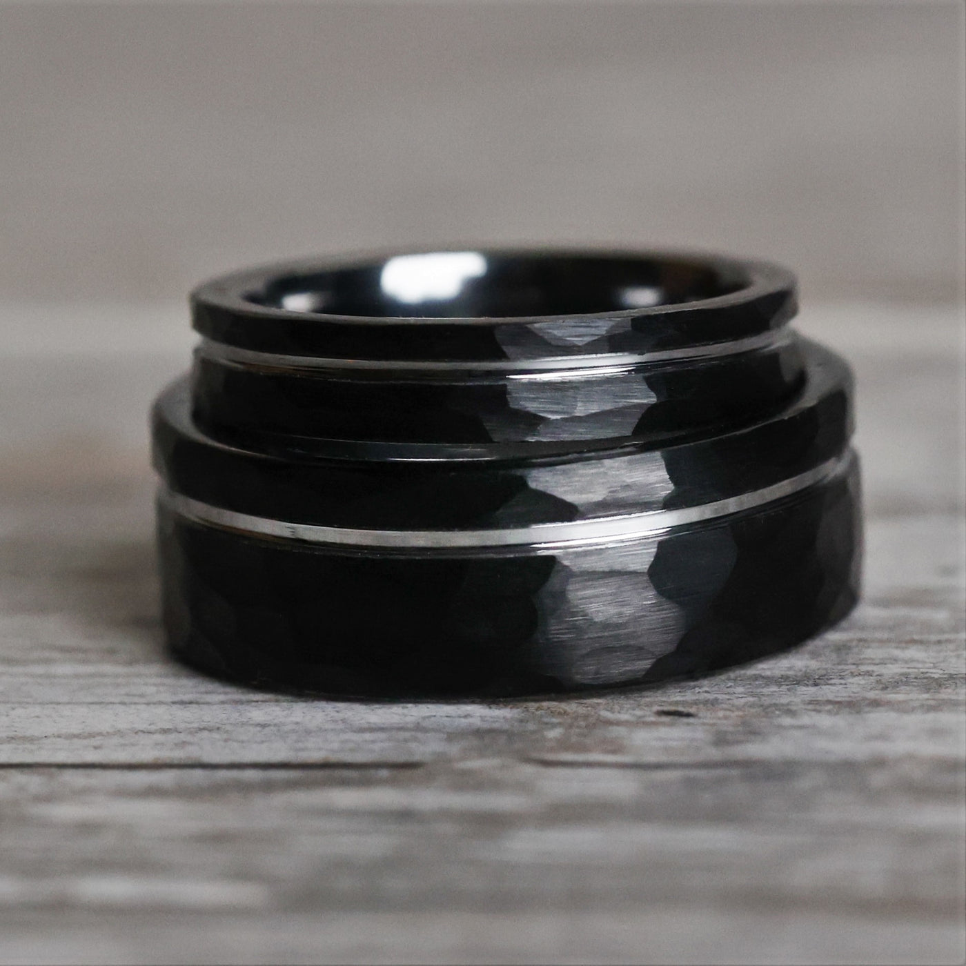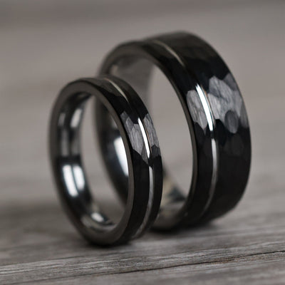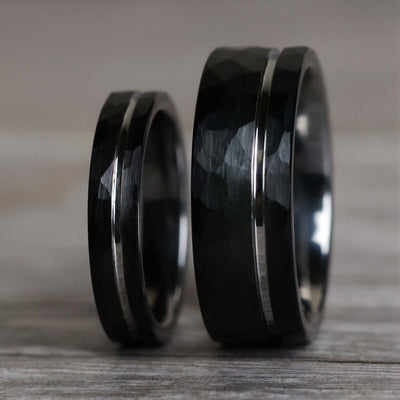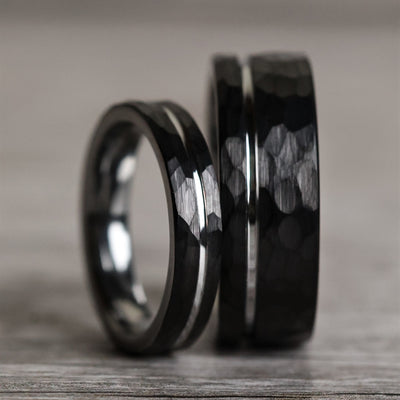 Hammered black tungsten carbide marries with a polished silver interior and offset gray inlay in these modern, minimalist wedding bands.