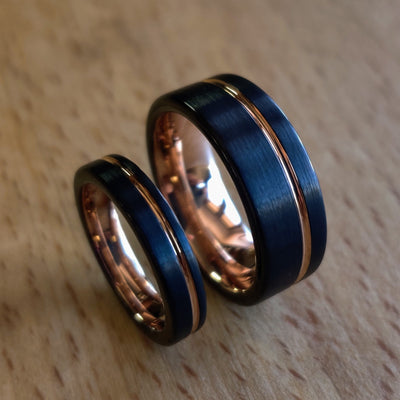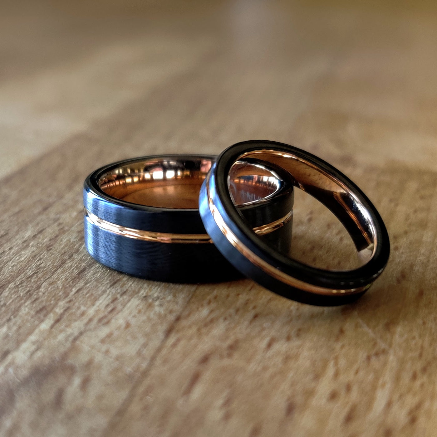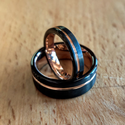 This gold ring set features a black tungsten carbide exterior, with a rose gold anodized titanium interior and inlay. It's perfect as a wedding ring set, engagement ring set, or for any occasion. The design is simple, modern, and requires no maintenance.