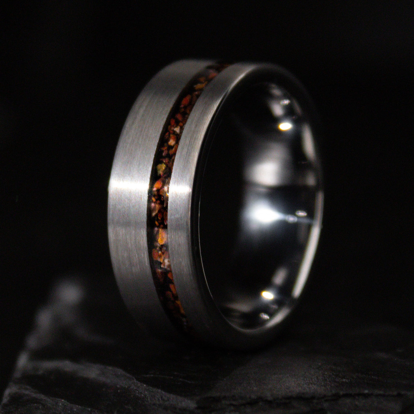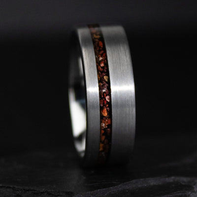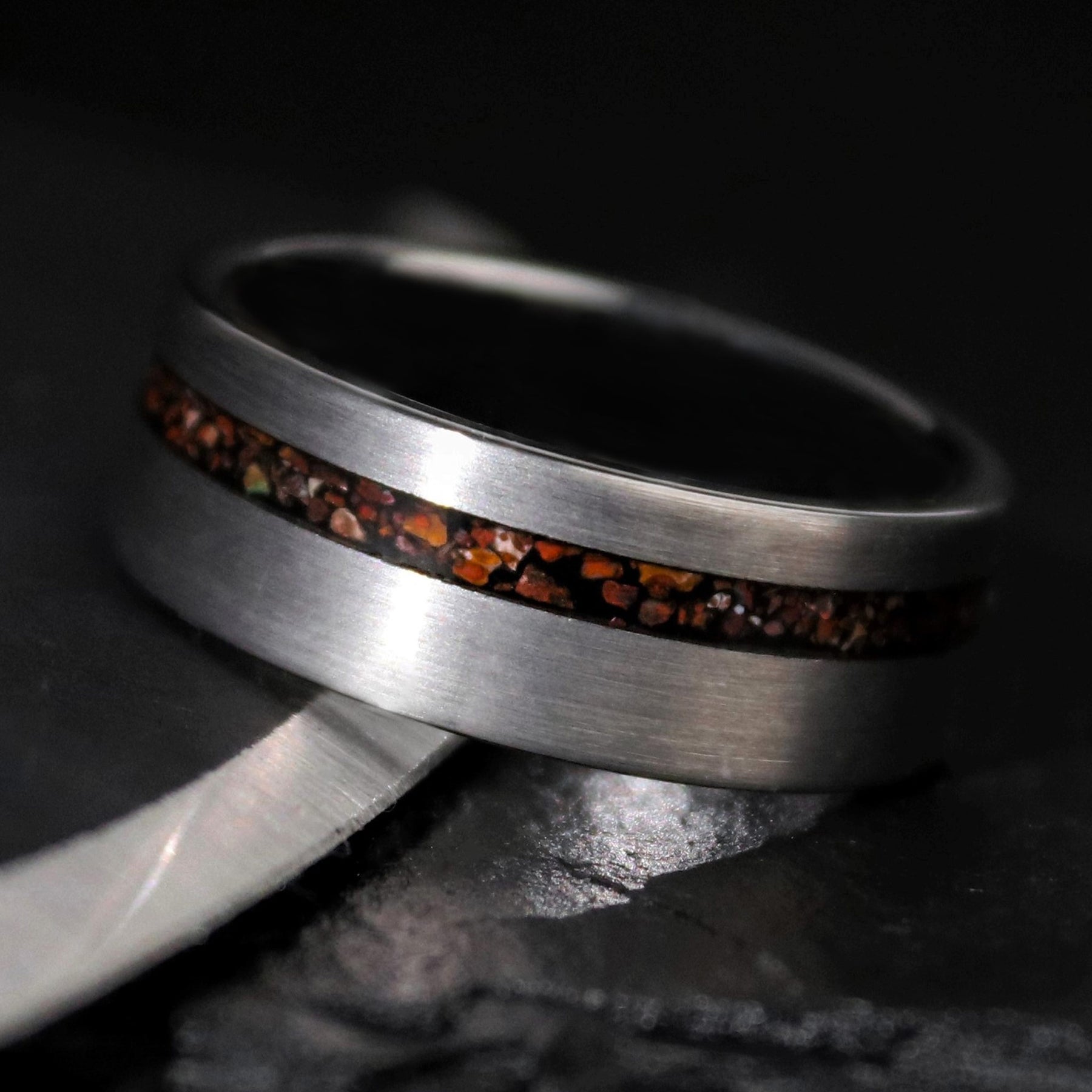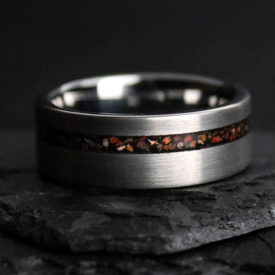Tyrannosaurus Rex, the Tyrant King of the dinosaurs inhabited our world around 65 million years ago. One of the largest and most fearsome of all the dinosaurs, T-Rex is world renown for captivating imaginations (My 4 year old is obsessed... so am I). Genuine T-Rex bone is inlaid into this gray Tungsten Carbide wedding band. T-Rex bone's figure ranges from red/orange to deep black tones.